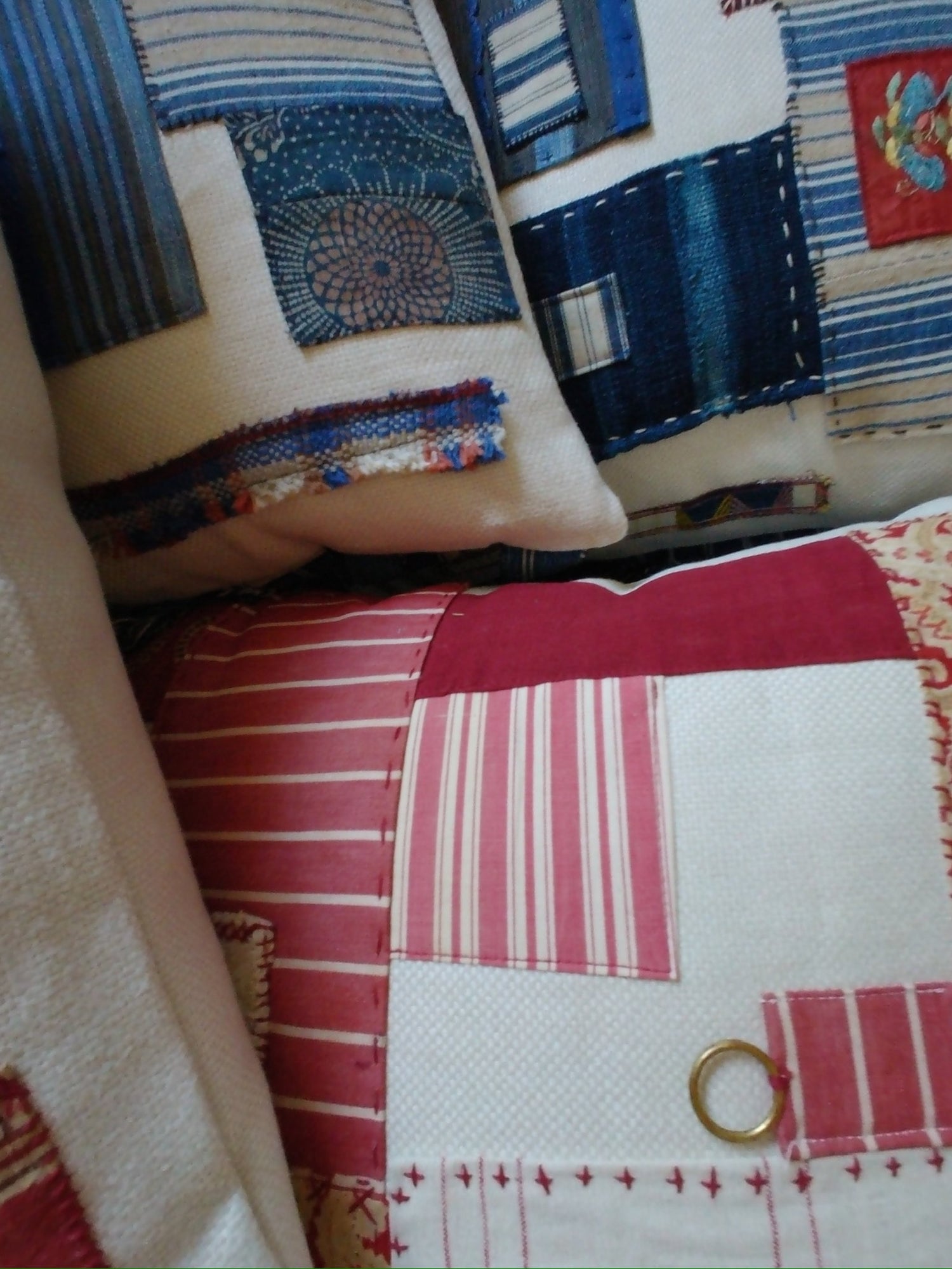 Each pillow in this collection is crafted using salvaged scraps from our one-of-a-kind collection, giving new life to humble remnants. These pieces are thoughtfully repurposed into charming collages that celebrate the inherent beauty and rich history of the materials.