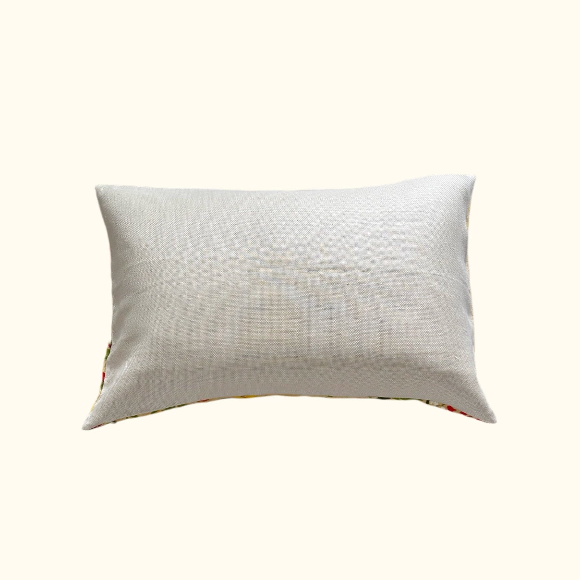 - All pillows are carefully constructed with the finest natural materials. As the fronts are vintage and antique textiles, some imperfections may be present. Great care and attention has been taken to ensure that significant tears or stains have been addressed or avoided. The vintage textiles have been lined, and each pillow is sewn with overlocked inside seams with generous seam allowances and finished with hidden zippers. Back fabrics are either natural linen or cotton velvet.
