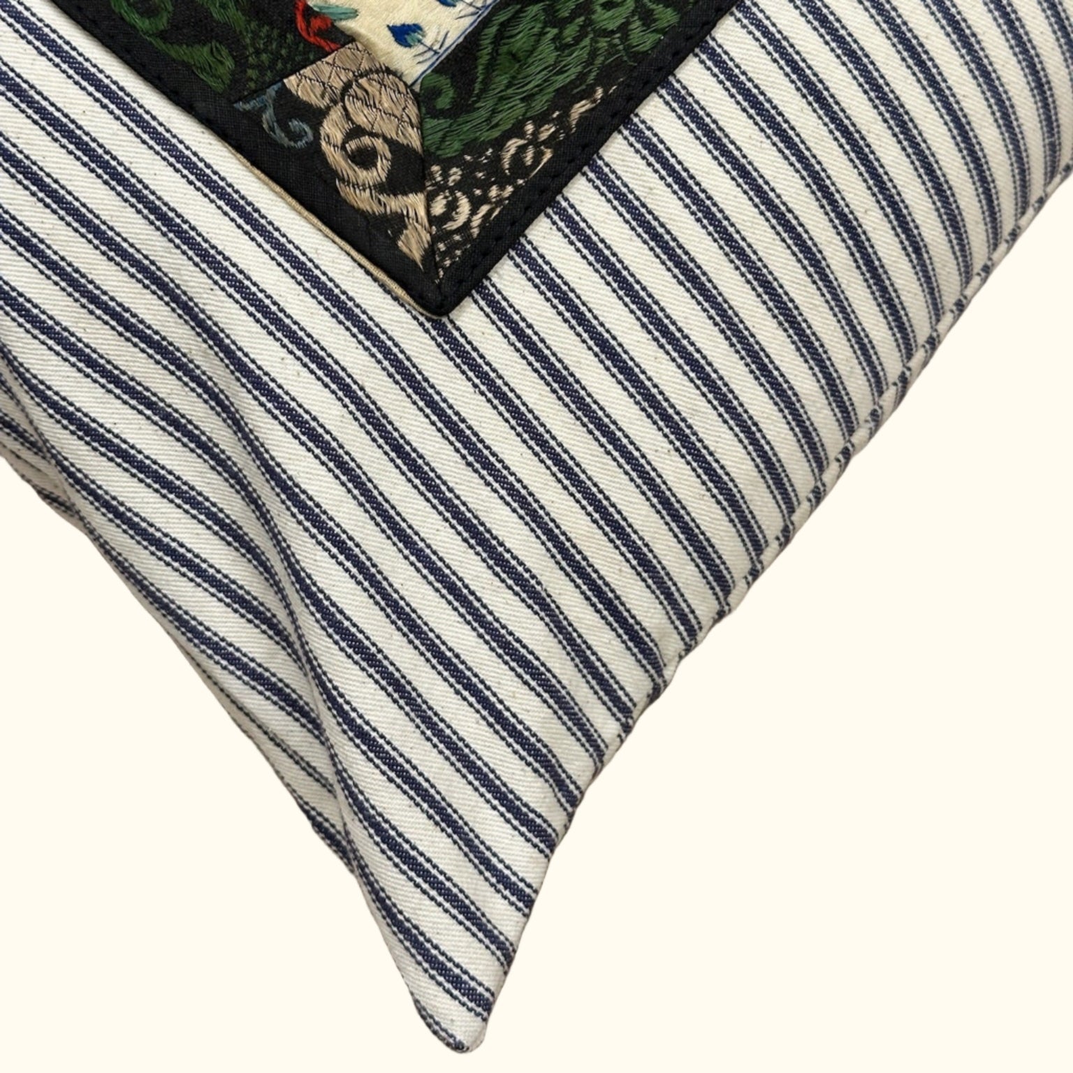 - All pillows are carefully constructed with the finest natural materials. As the fronts are vintage and antique textiles, some imperfections may be present. Great care and attention has been taken to ensure that significant tears or stains have been addressed or avoided. The vintage textiles have been lined, and each pillow is sewn with overlocked inside seams with generous seam allowances and finished with hidden zippers. Back fabrics are either natural linen or cotton velvet.