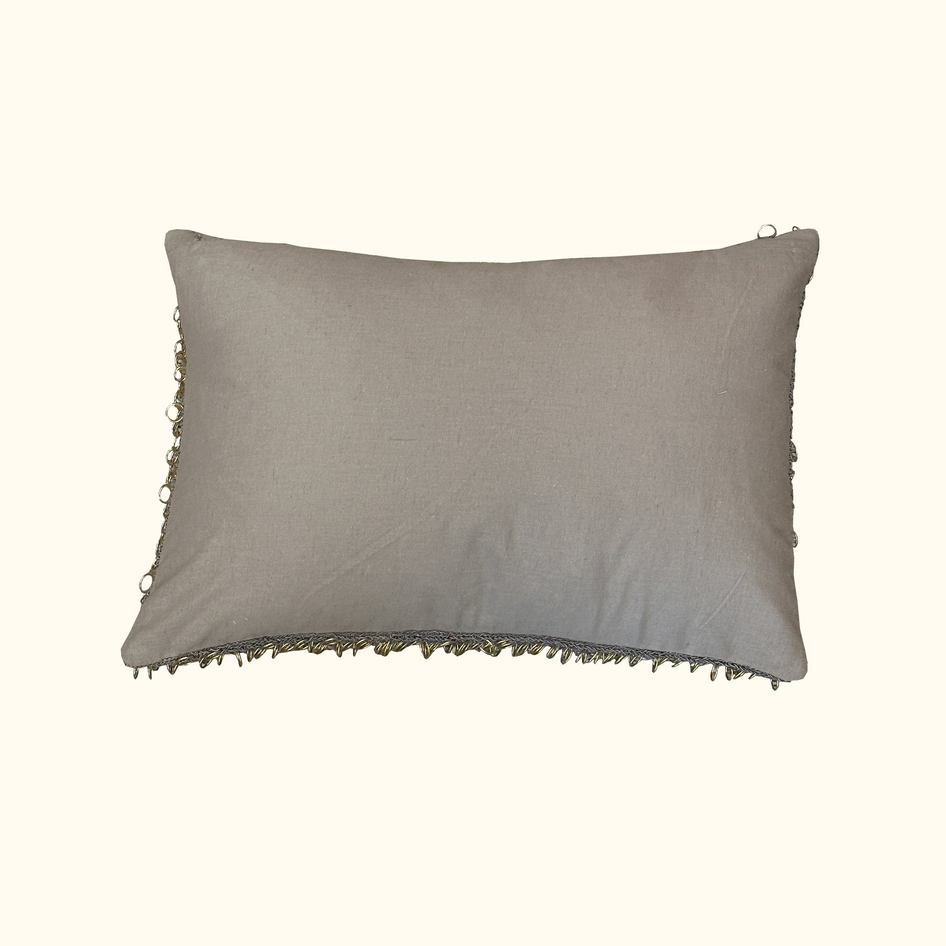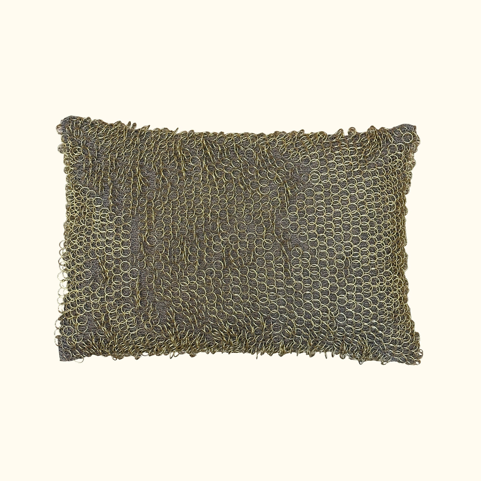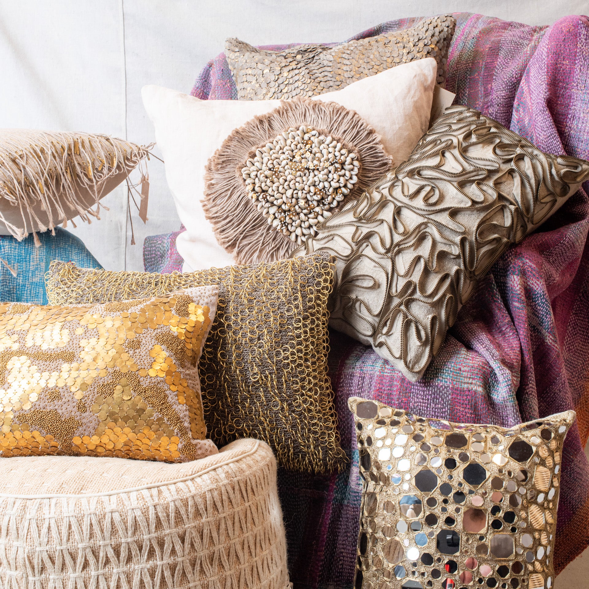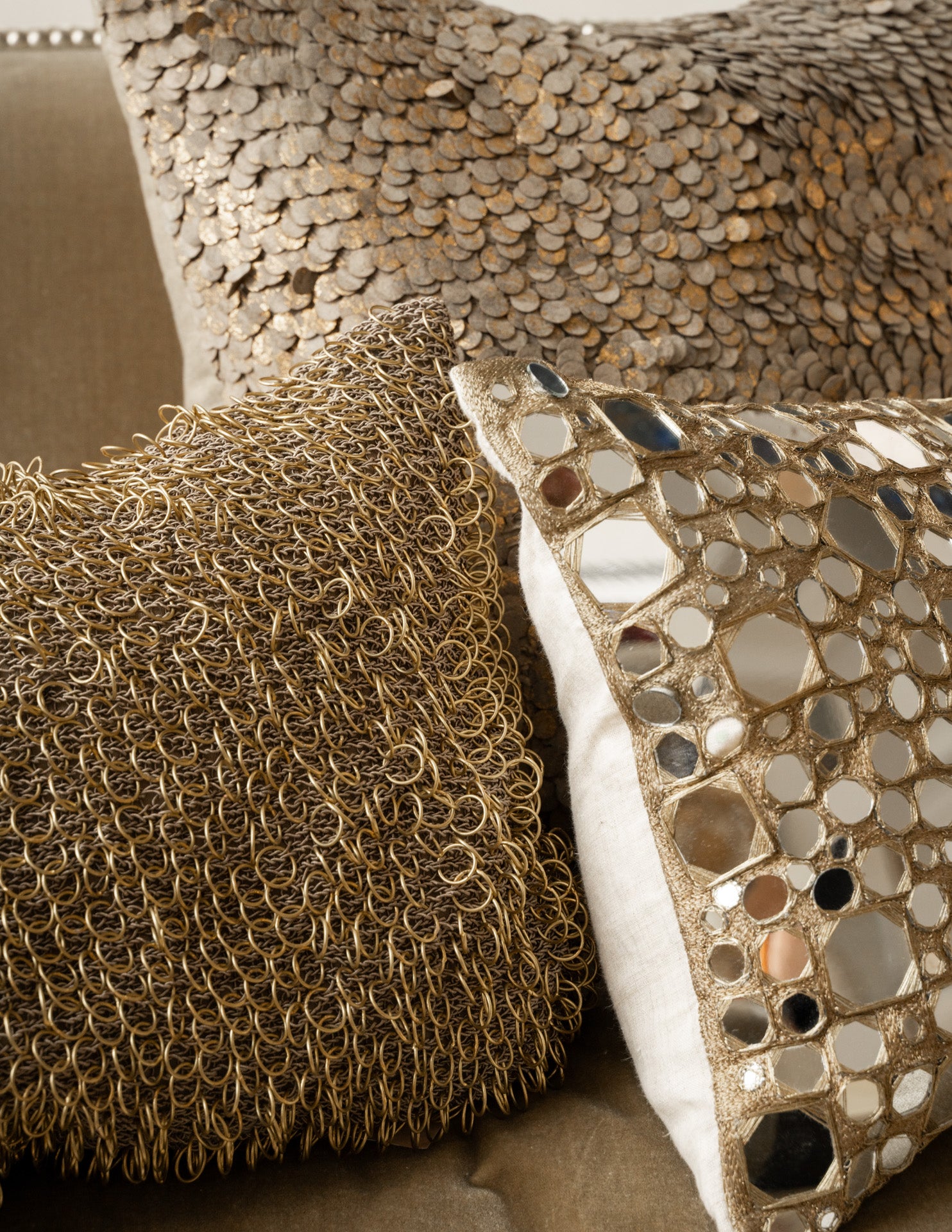 For our Heavy Metal collection, brass charms, rings and coins, bronze zippers and mirror fragments are juxtaposed against natural linen and jute to create sophisticated pillows with a rebel heart.
