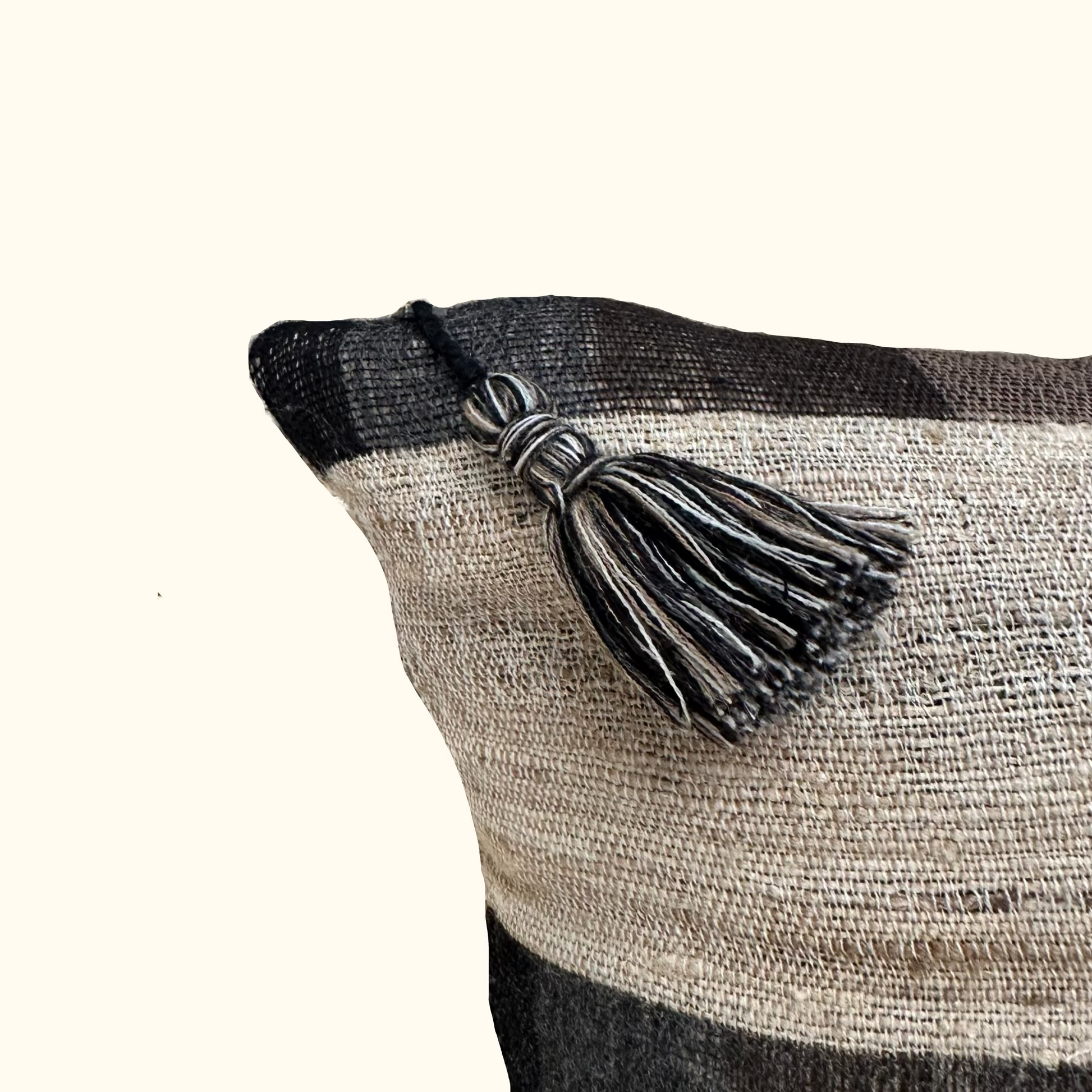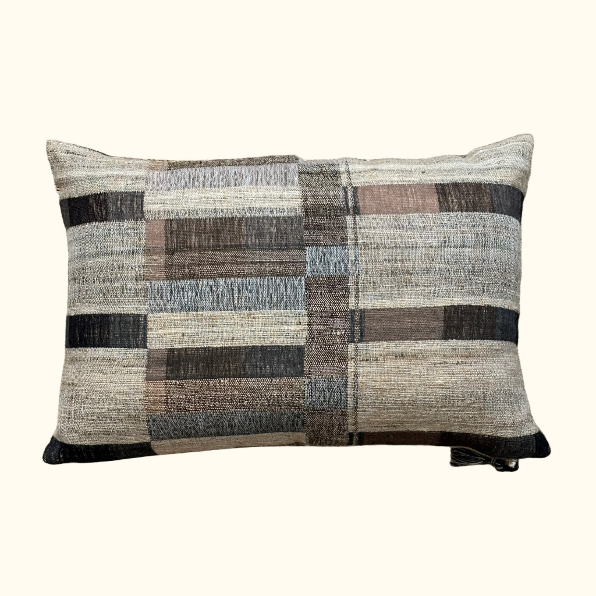 Merino wool and wild silk are hand-spun to create yarn with incredible character and texture. Handwoven on a traditional jacquard loom by a single weaver, these unique textiles feel both contemporary and timeless. Featuring a fun zipper pull made from the same yarn and finished with a knife edge, this piece beautifully blends craftsmanship with thoughtful details.