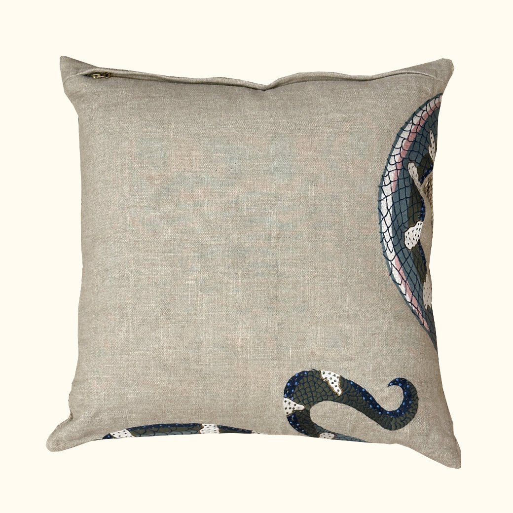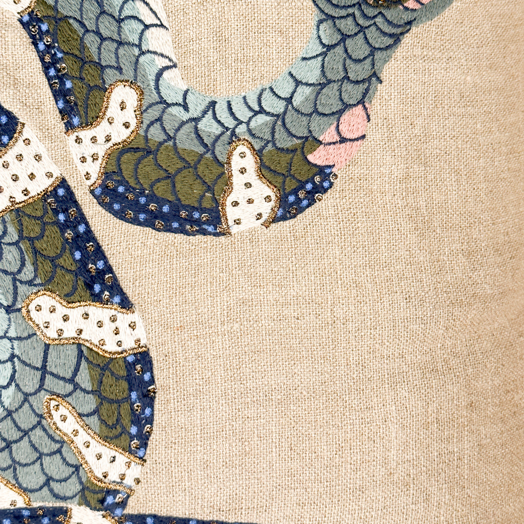 Snakes are mysterious, sexy, and beautiful…especially with hand embroidered scales that shimmer in the light. The snake slithers onto the back of the pillow, too, for dimension and a sense of movement. Hand-applied bead accents create added allure and temptation.