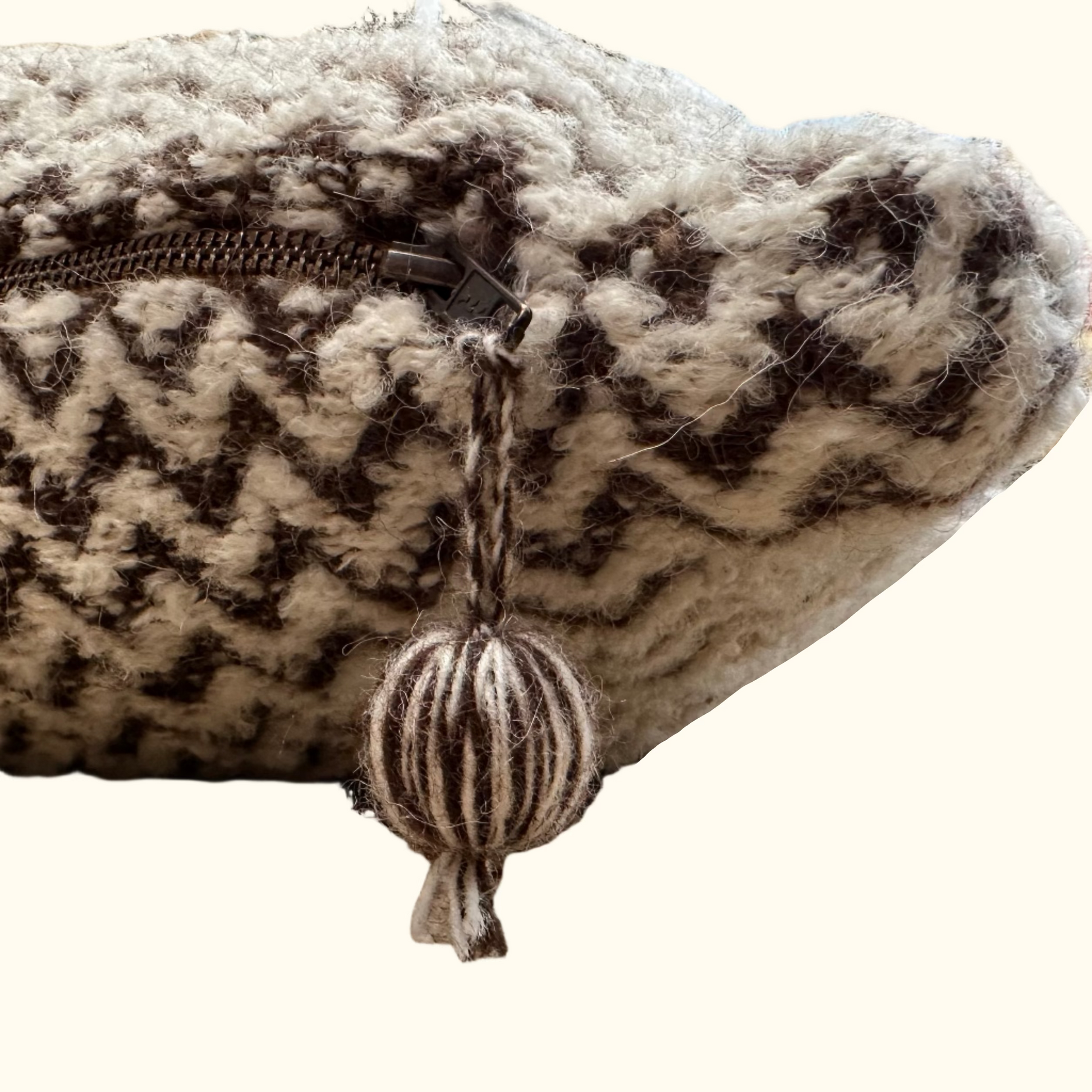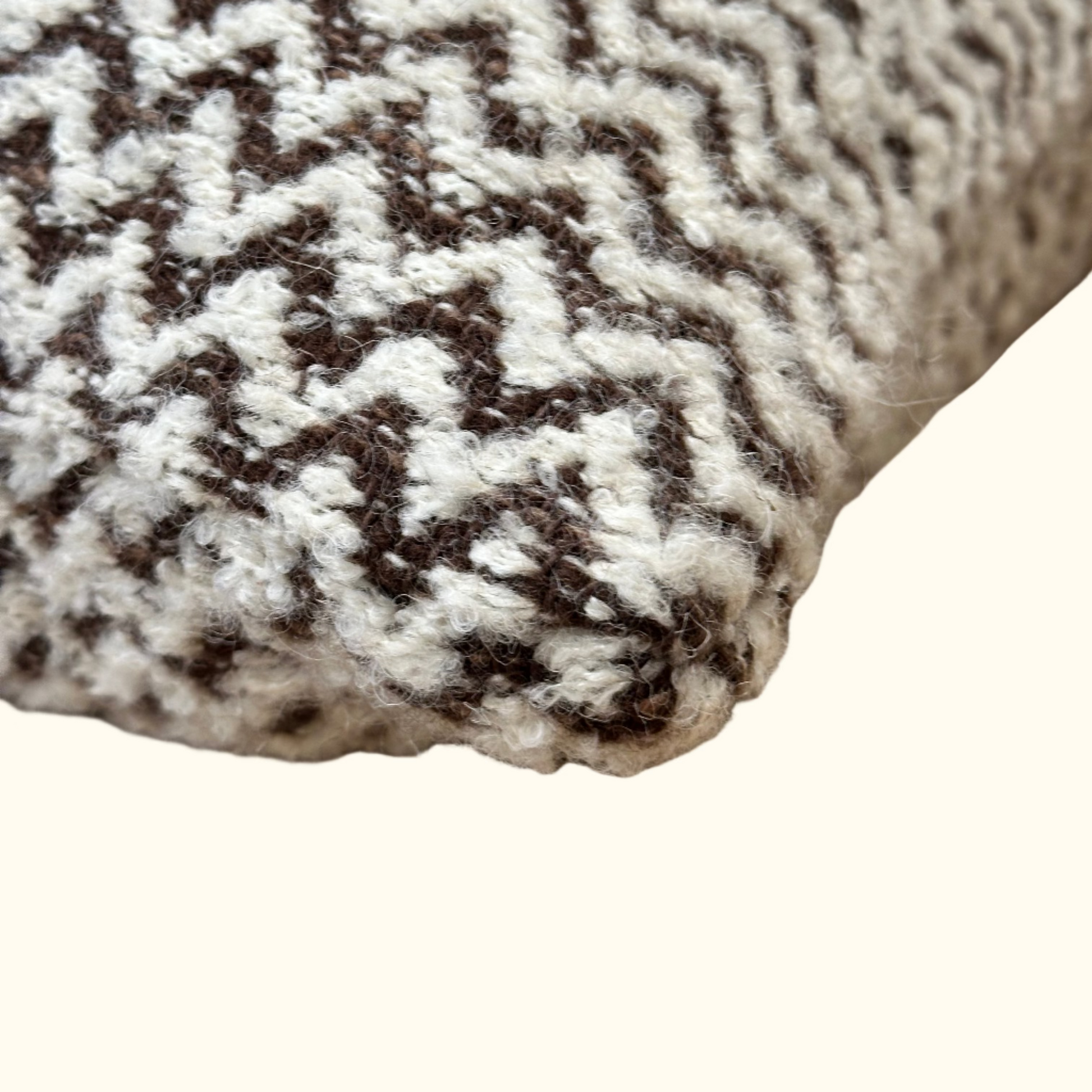 A classic chevron pattern is hand woven in chunky New Zealand wool and alpaca, creating a timeless and cozy pillow when you want both comfort and sophistication. The chunky metal zipper and wool-wrapped ball zipper pull create the finishing touch.