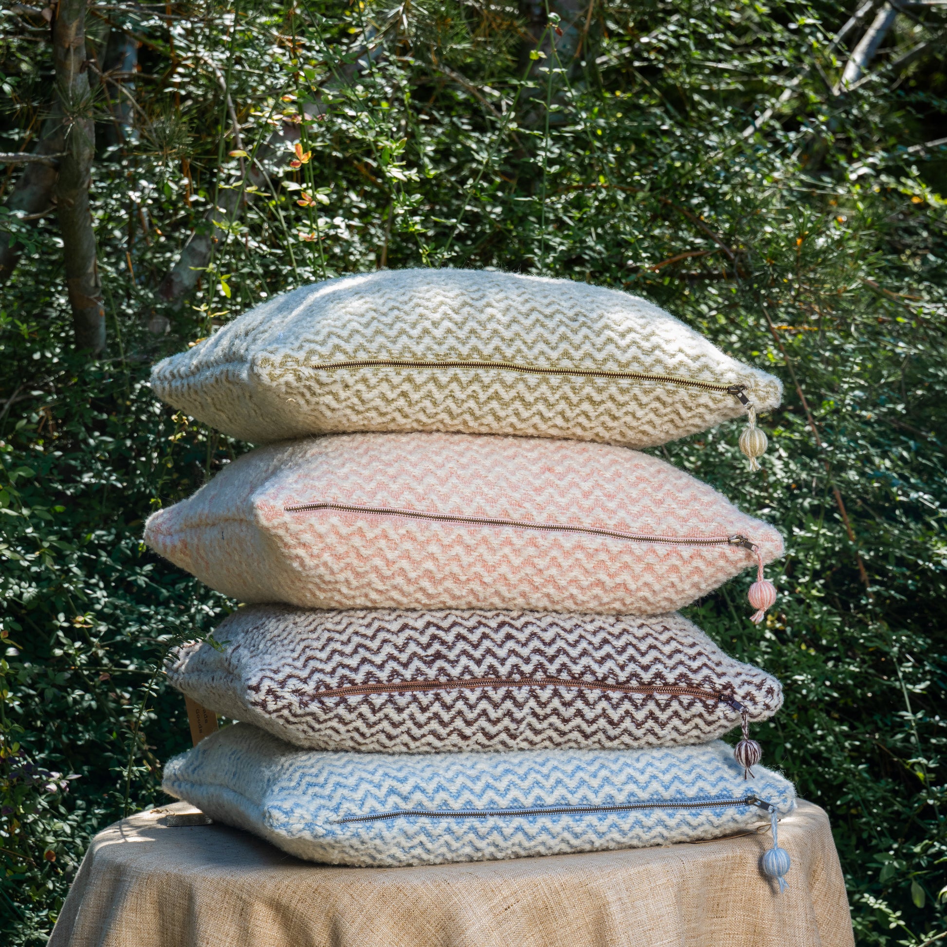 A classic chevron pattern is hand woven in chunky New Zealand wool and alpaca, creating a timeless and cozy pillow when you want both comfort and sophistication. The chunky metal zipper and wool-wrapped ball zipper pull create the finishing touch.