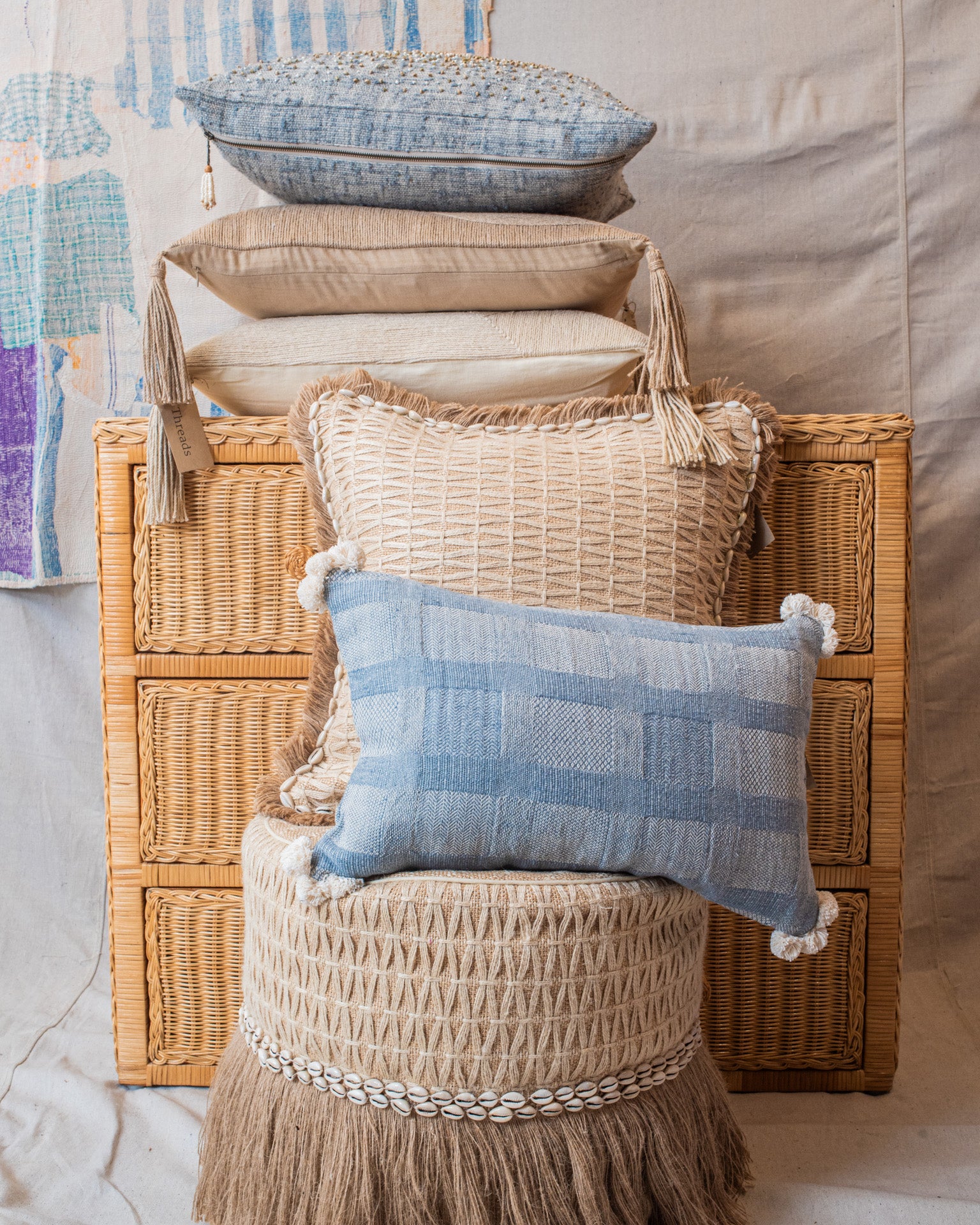 Jacquard looms and high twist yarns are used to great effect to create a fresh spin on classic patterns. Finished with our unique trims, tassels and beads, they are sure to surprise and delight.