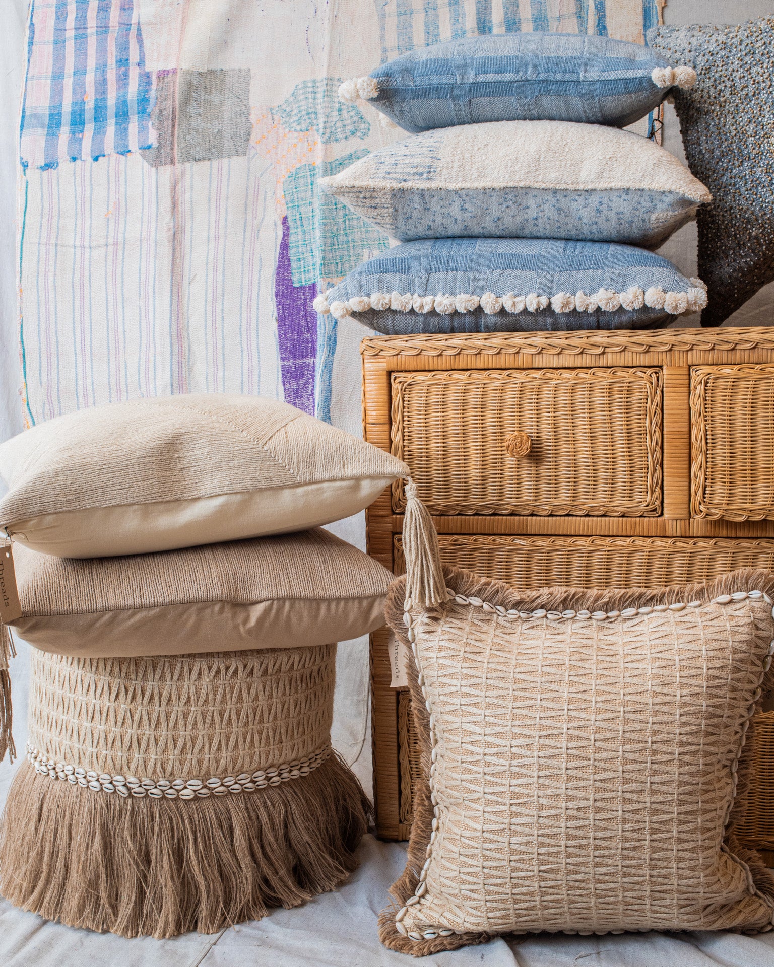 Jacquard looms and high twist yarns are used to great effect to create a fresh spin on classic patterns. Finished with our unique trims, tassels and beads, they are sure to surprise and delight.
