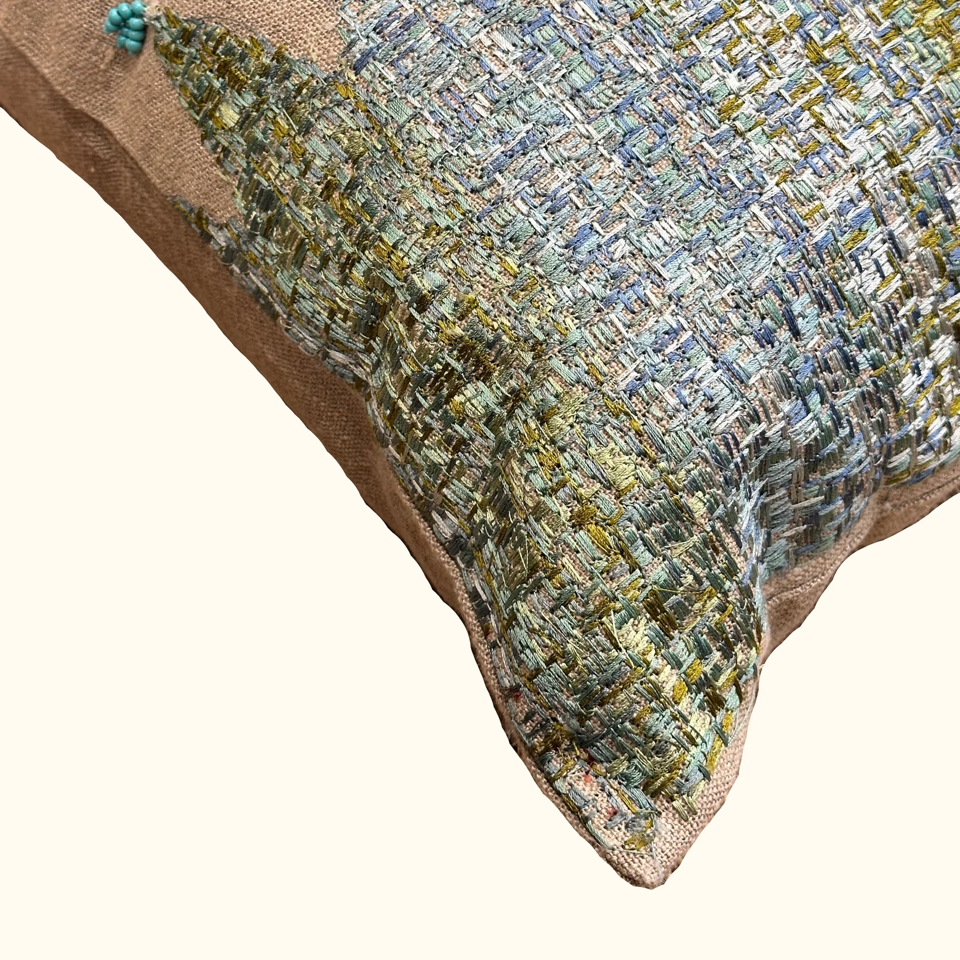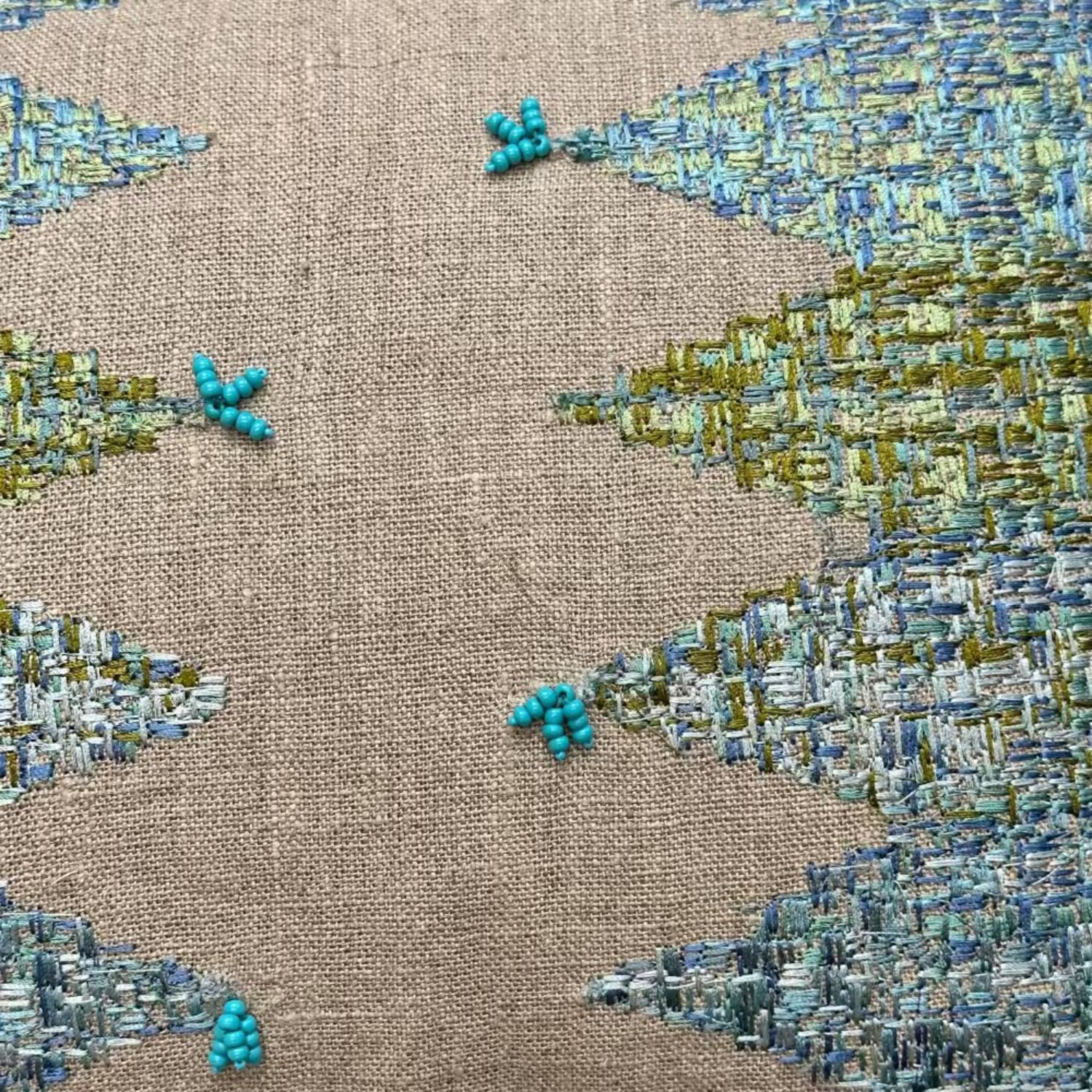 Undyed natural linen is the perfect backdrop for this dense color play of tonal turquoise and green embroidery. Pillow is embellished with dangling turquoise bead clusters for added movement and playfulness.