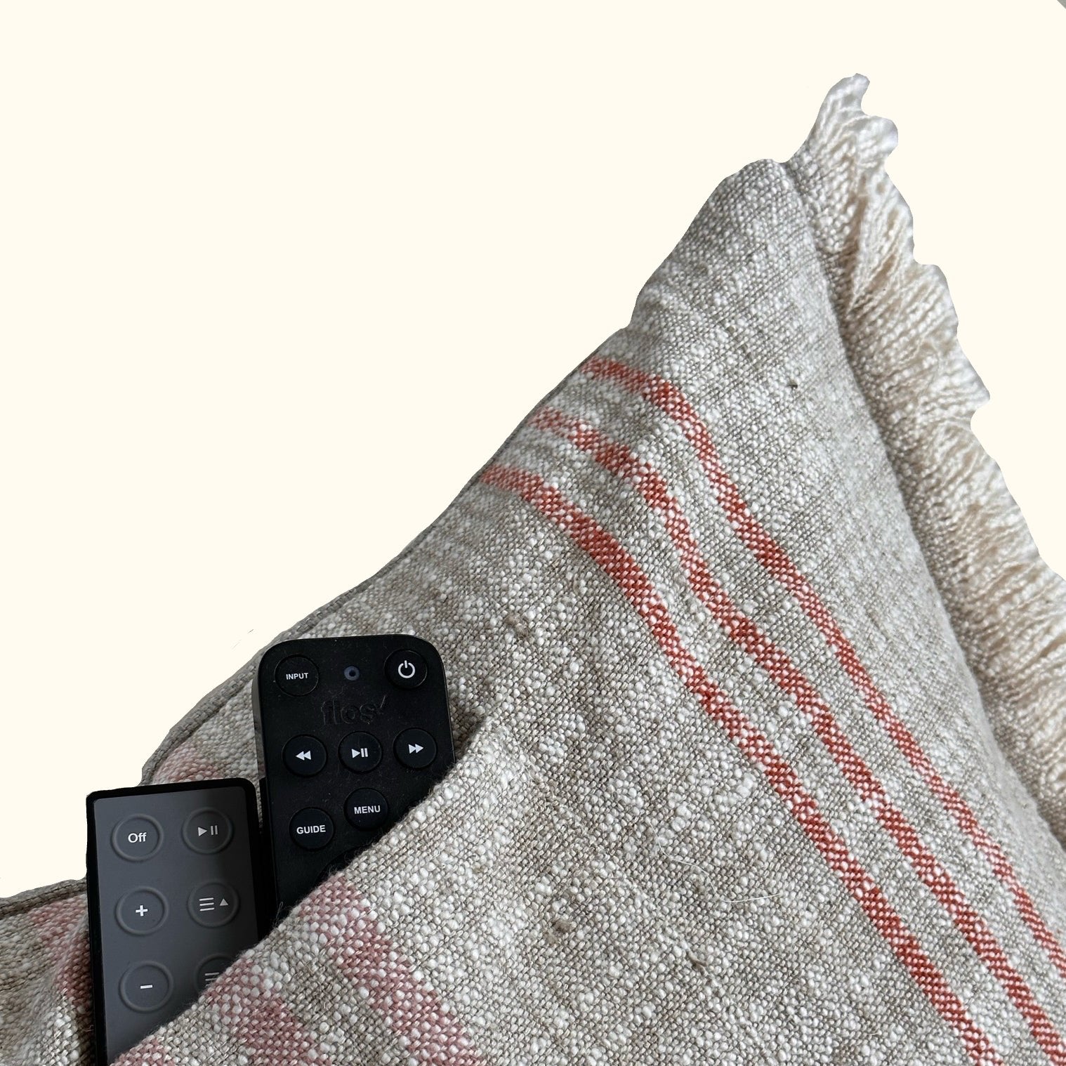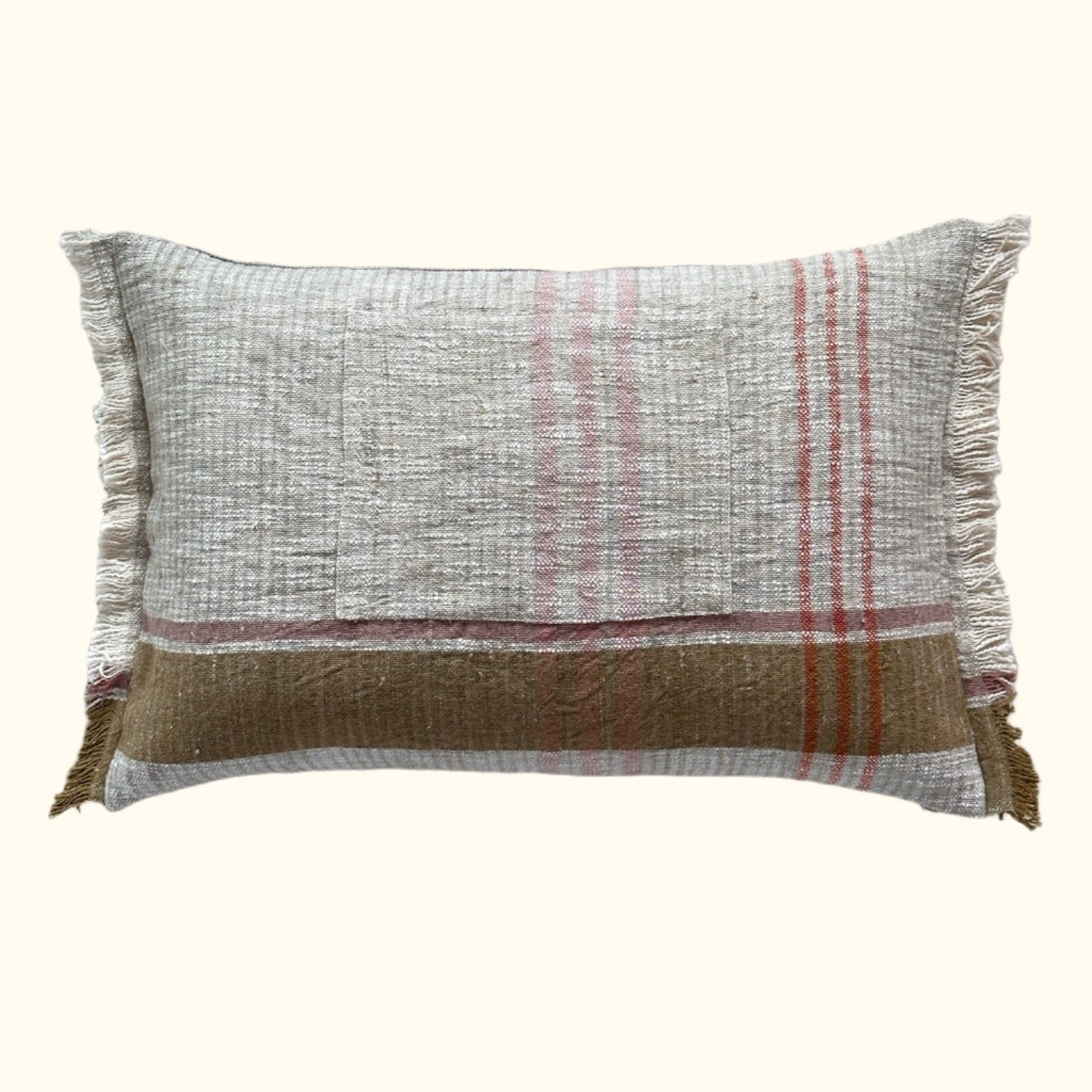 - All pillows are carefully constructed with the finest natural materials. As the fronts are vintage and antique textiles, some imperfections may be present. Great care and attention has been taken to ensure that significant tears or stains have been addressed or avoided. The vintage textiles have been lined, and each pillow is sewn with overlocked inside seams with generous seam allowances and finished with hidden zippers. Back fabrics are either natural linen or cotton velvet.