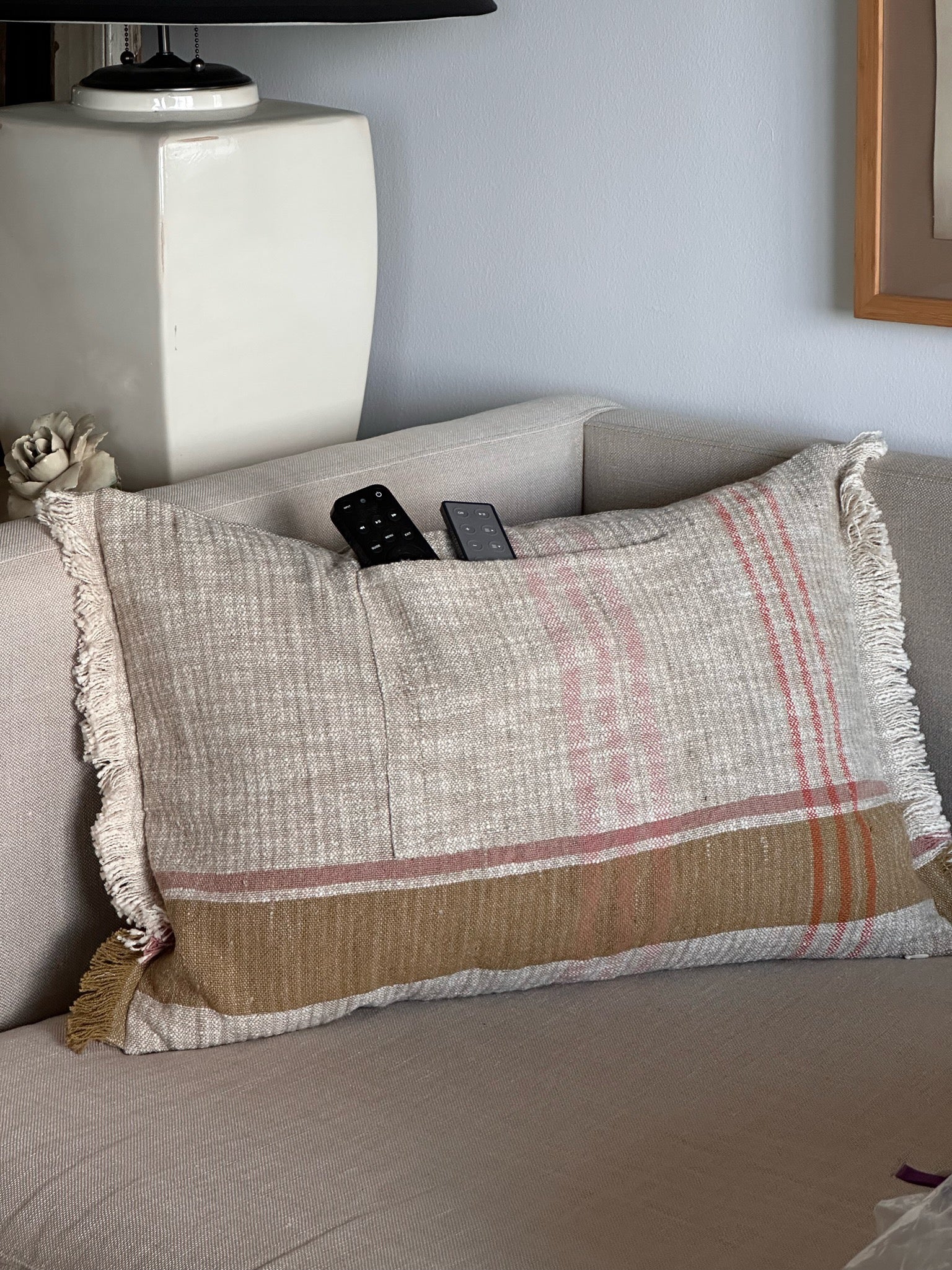 - Backed in natural linen
