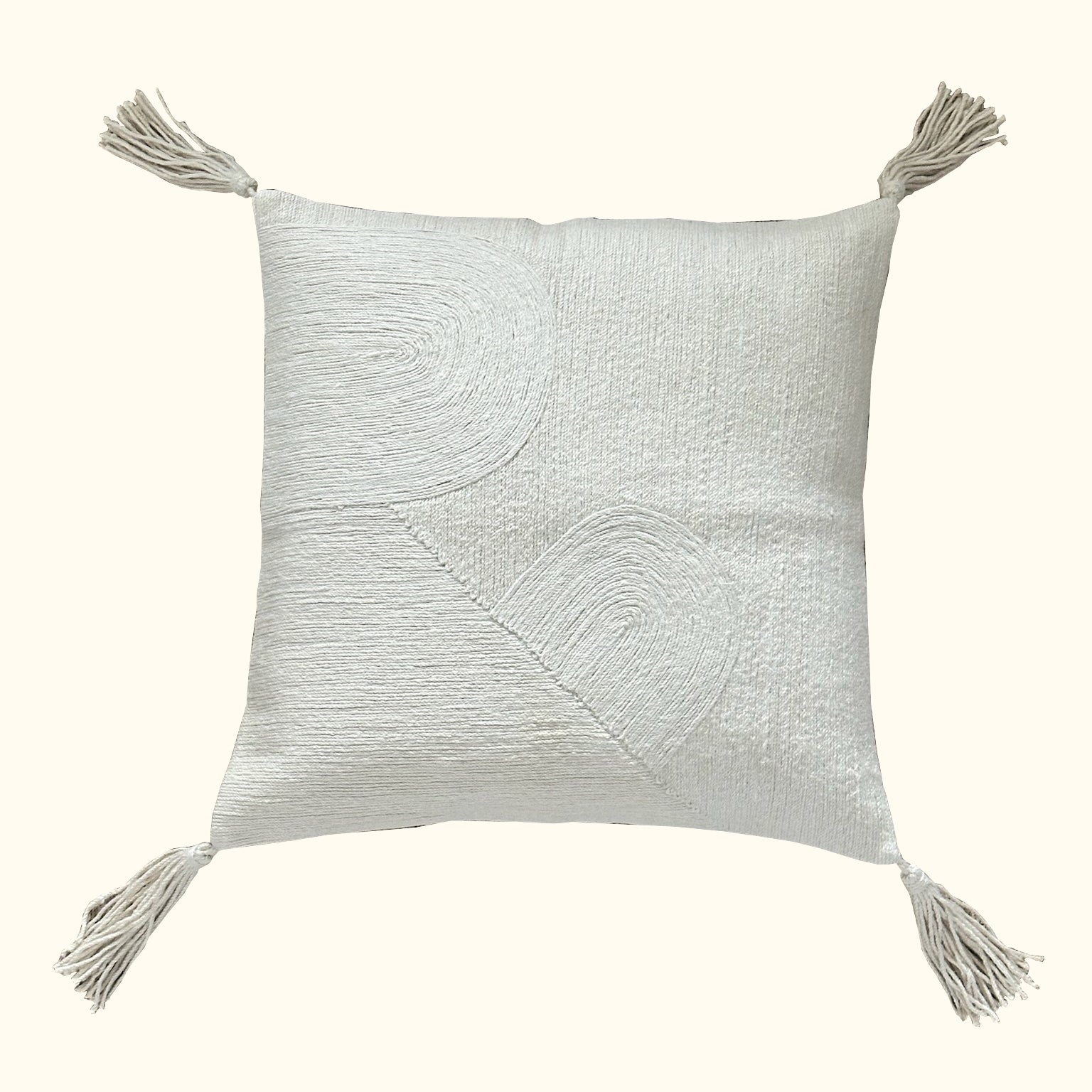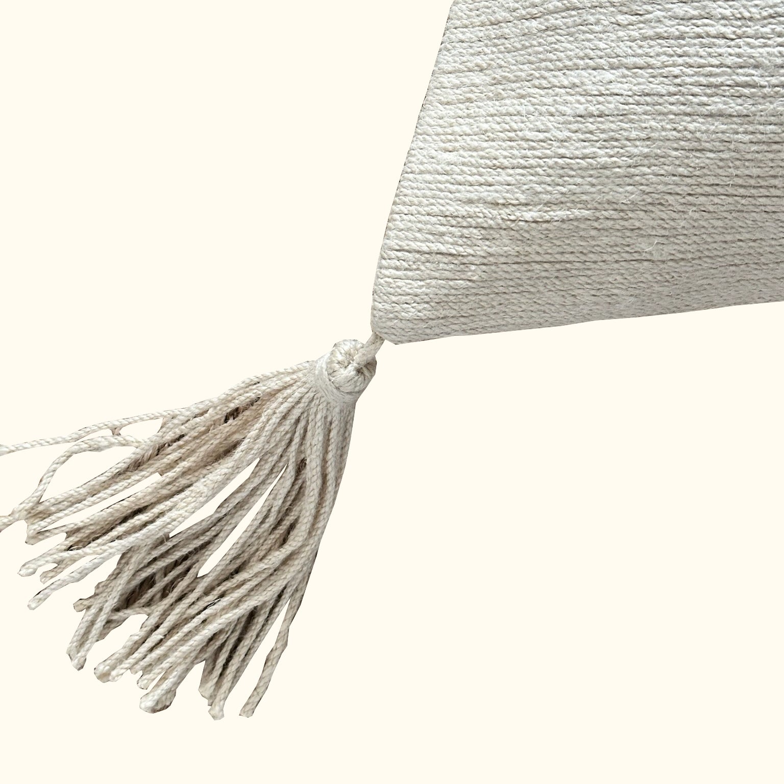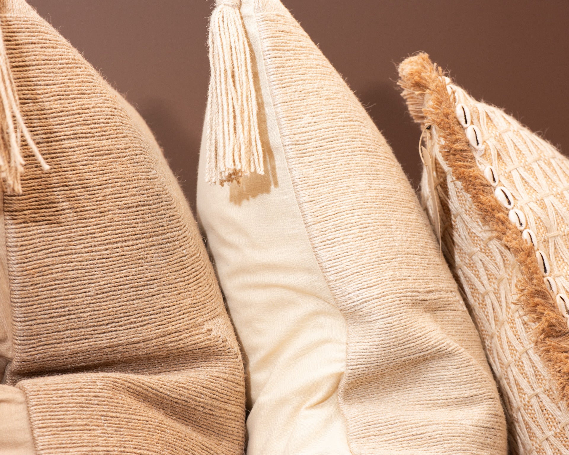 Natural jute is used in playful new ways to create surface interest and texture. Embellished with exaggerated tassels to bring a day at the beach indoors.
