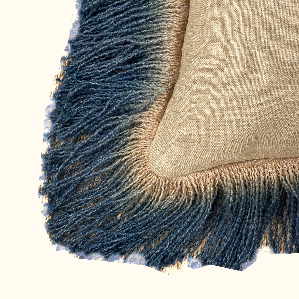 Jute twine is krimped and ombré dip-dyed by hand. Using this yarn to frame a natural linen fabric in a 6” exaggerated fringe creates a luxurious, rustic sophistication.
