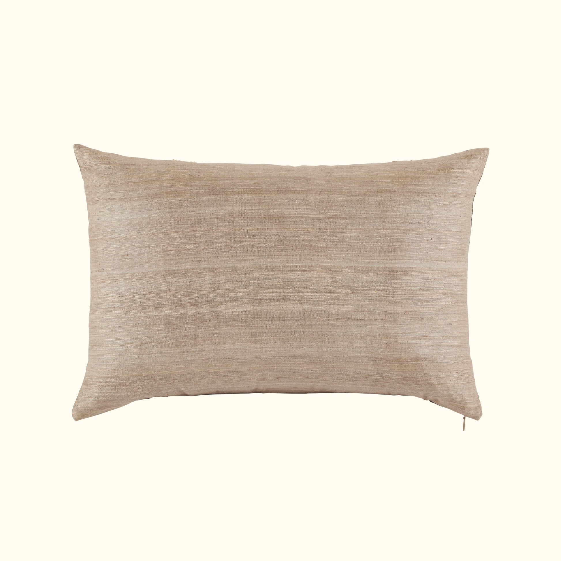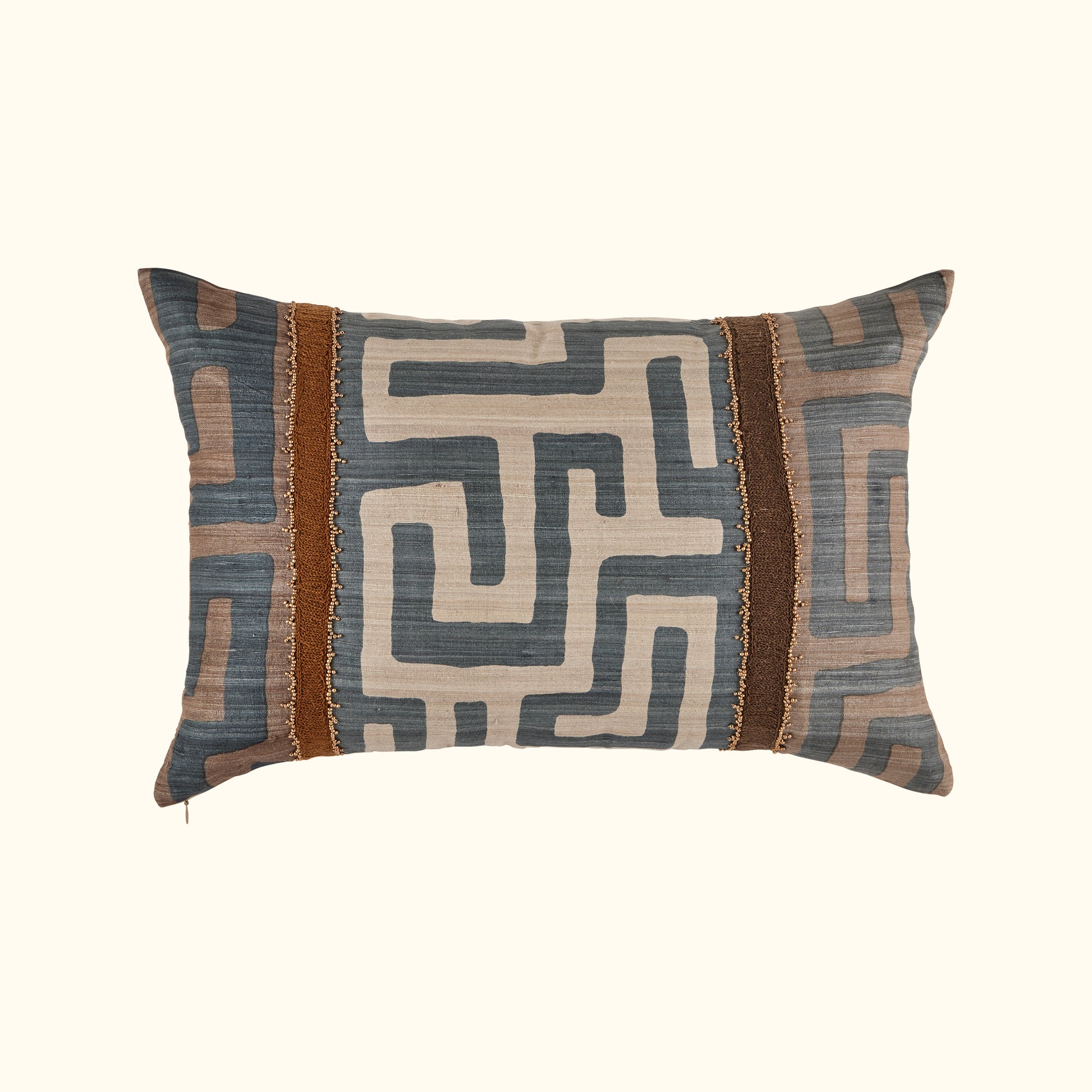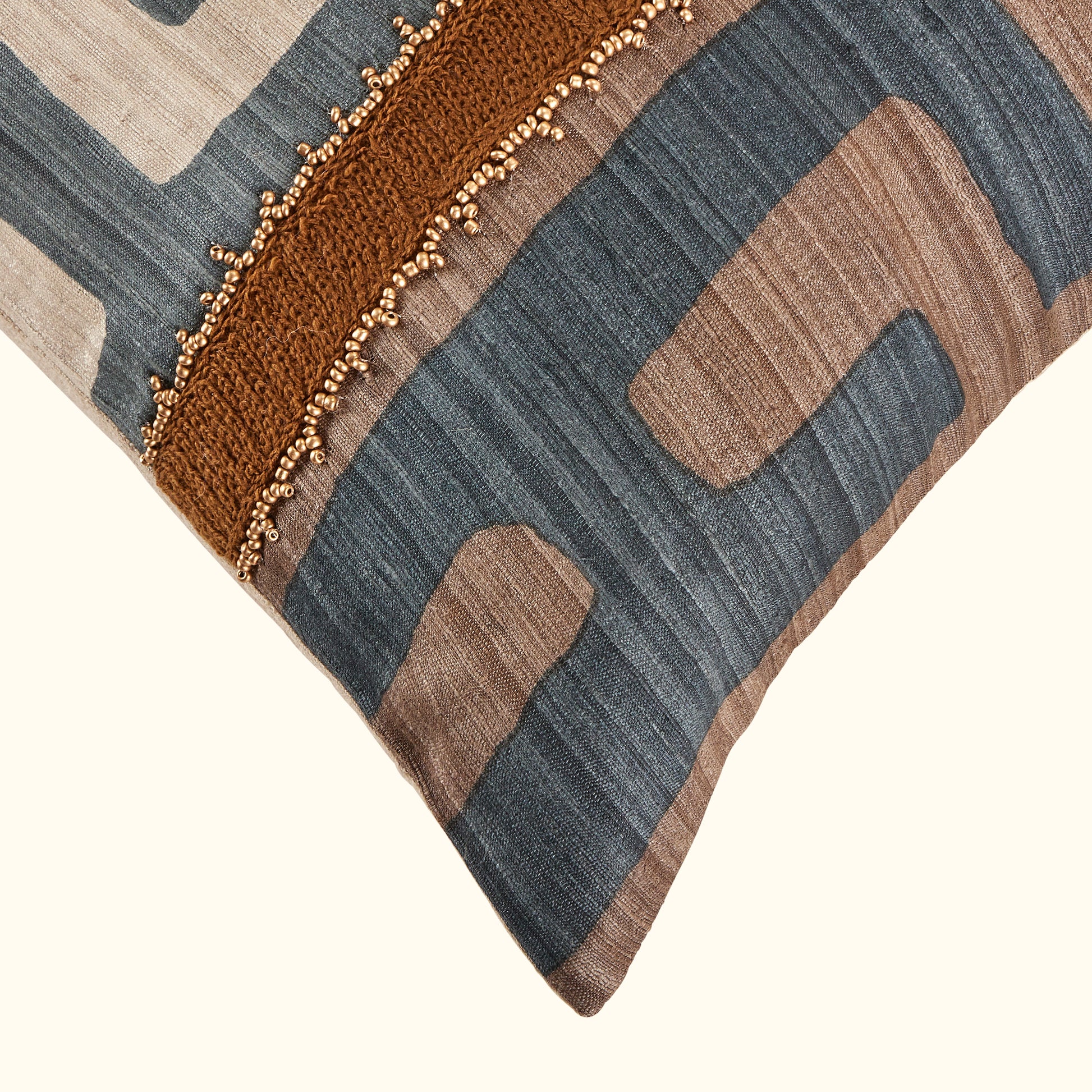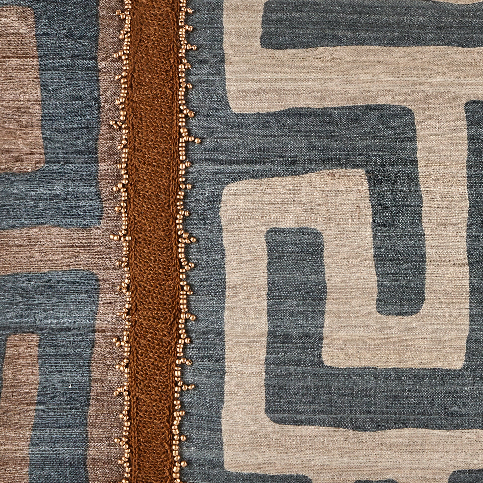 Kuba cloth, the native textile of the Kasai region in the Democratic Republic of Congo, was the inspiration for this gorgeous pillow. First printed on undyed wild silk, and then embellished with dense Ari embroidery and finished with patinated brass beads, this pillow is the perfect blend of rustic and sophisticated.