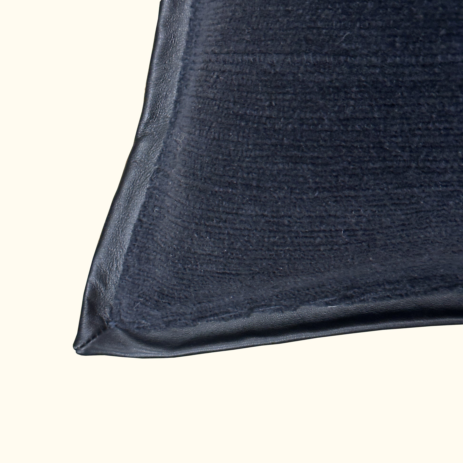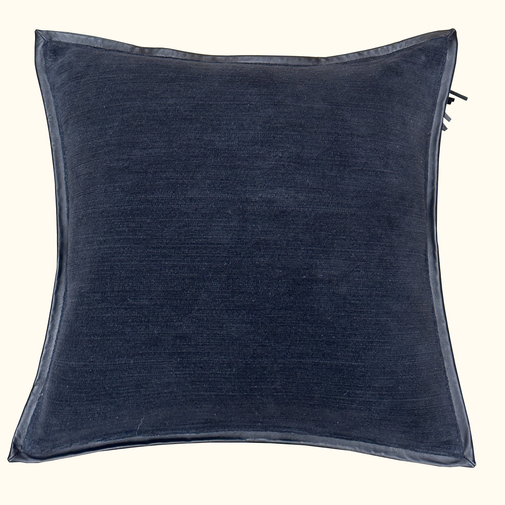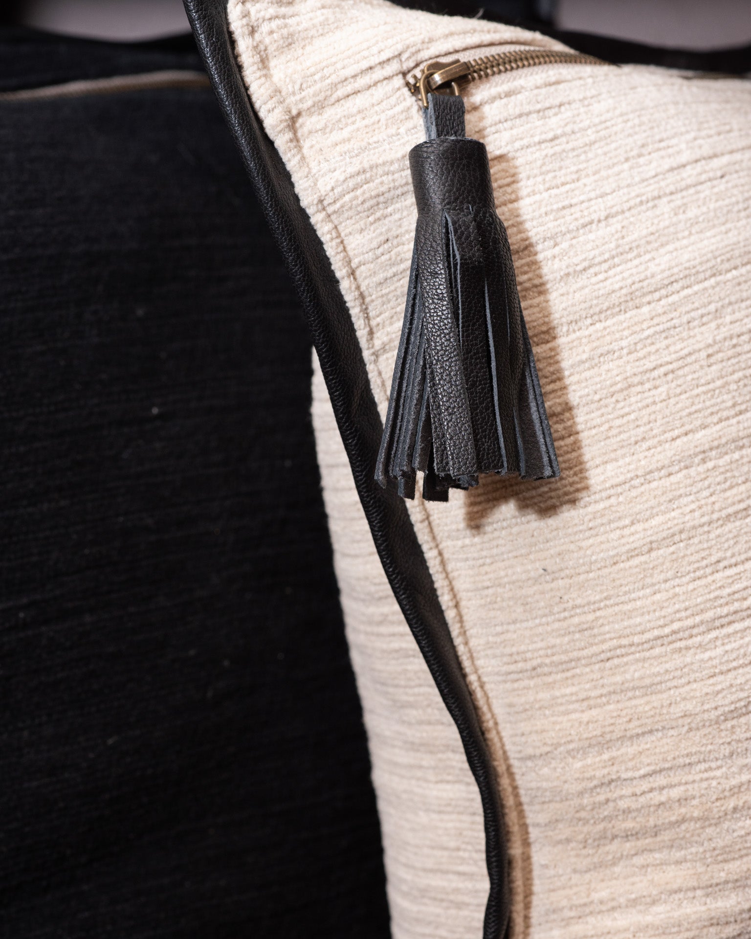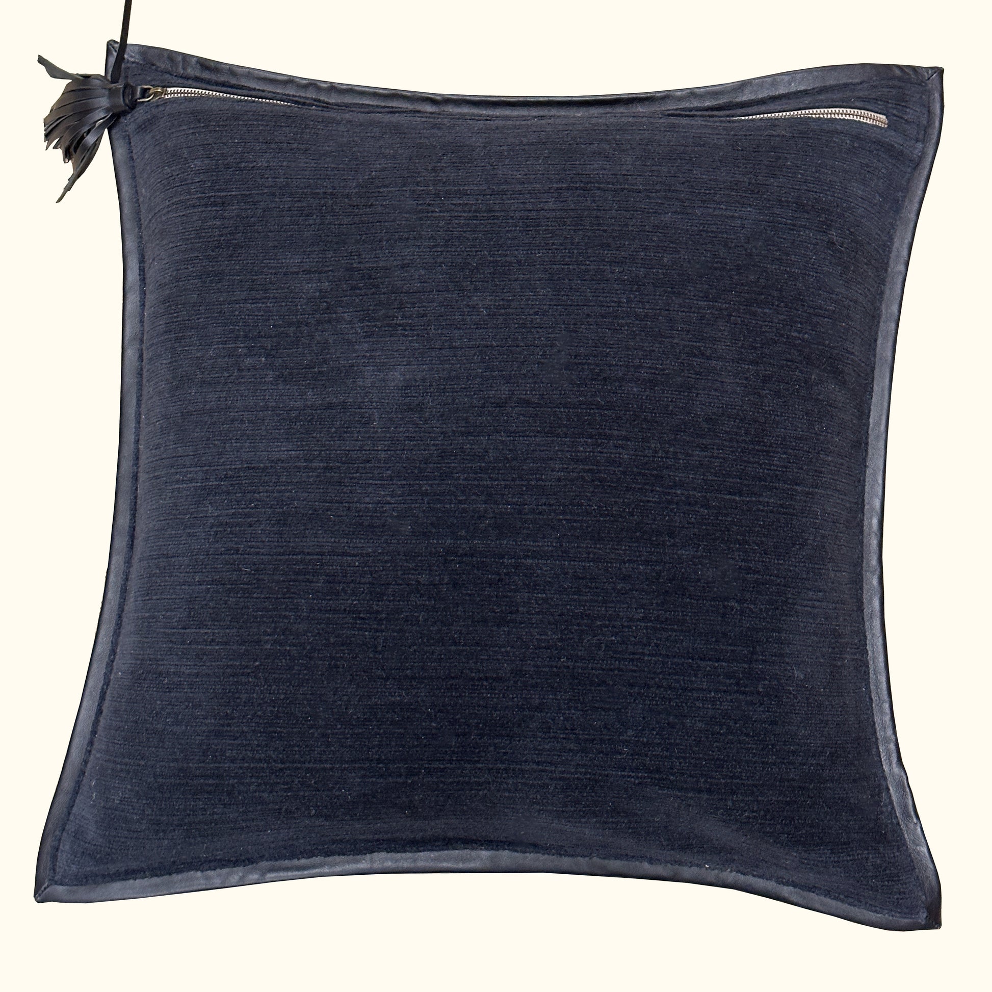 Heavy weight ribbed cotton chenille, bordered with a soft sheep leather flange, create an appealing classic. The added detail of a chunky metal zipper and oversized leather tassel give it a fresh, modern flare.