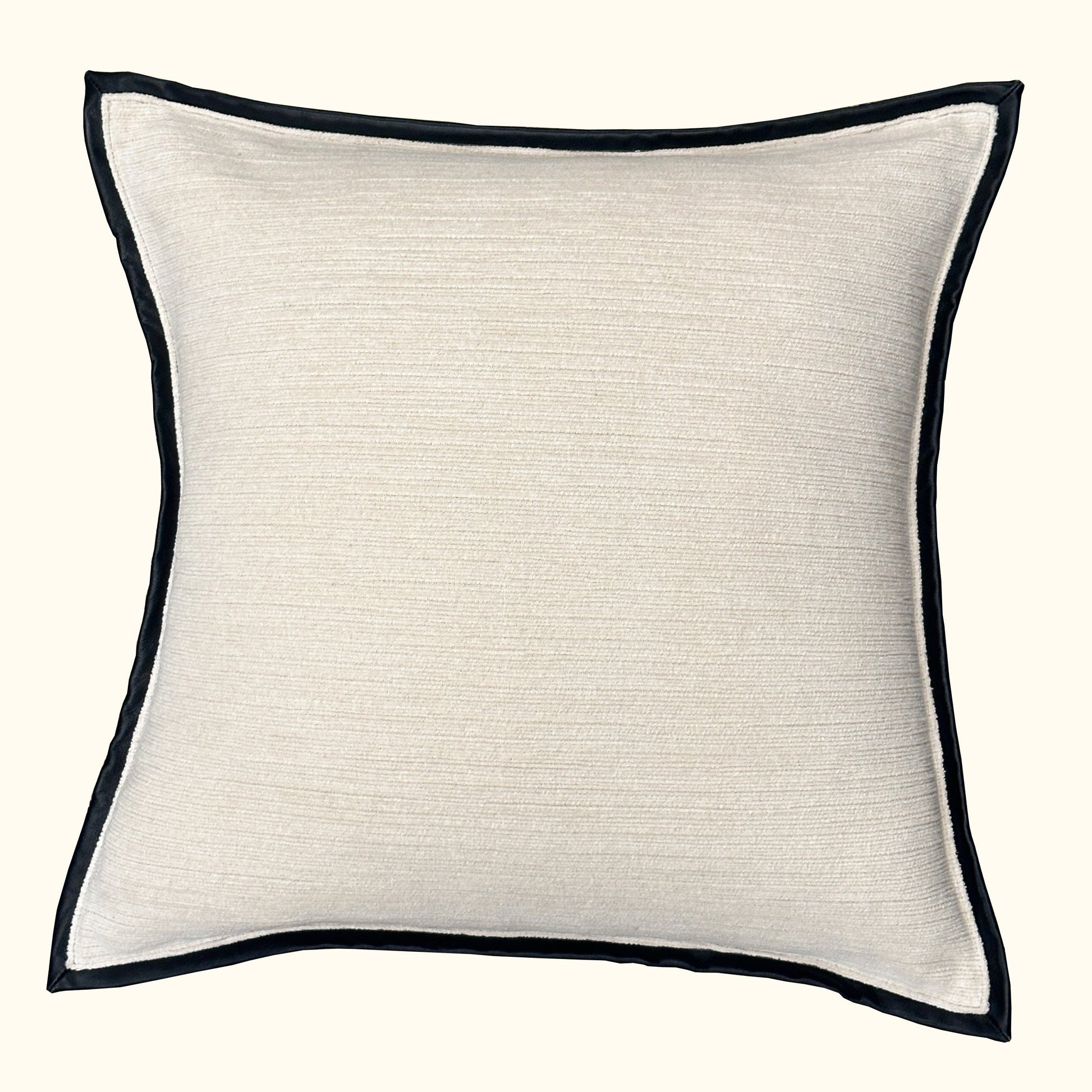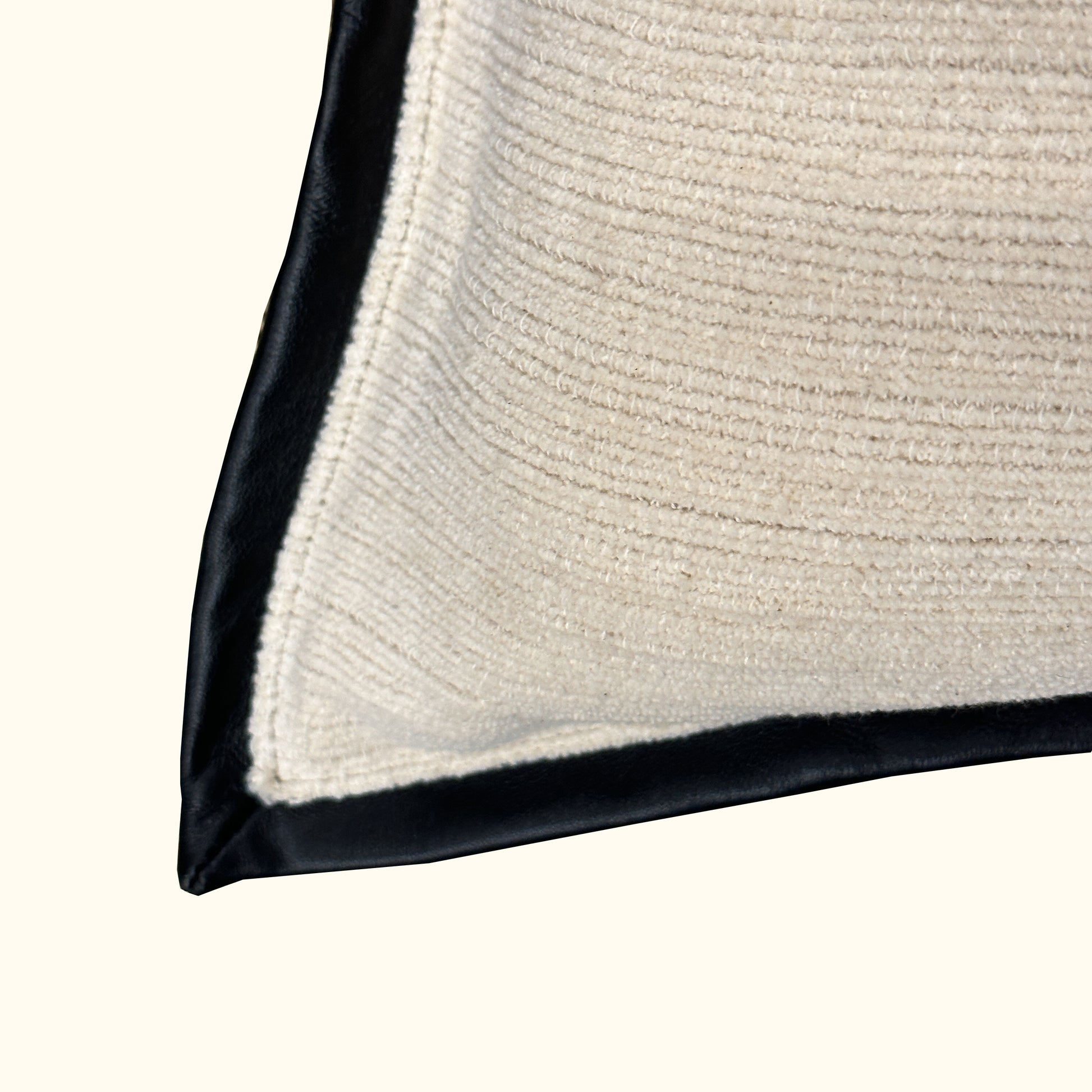 Heavy weight ribbed cotton chenille, bordered with a soft sheep leather flange, create an appealing classic. The added detail of a chunky metal zipper and oversized leather tassel give it a fresh, modern flare.