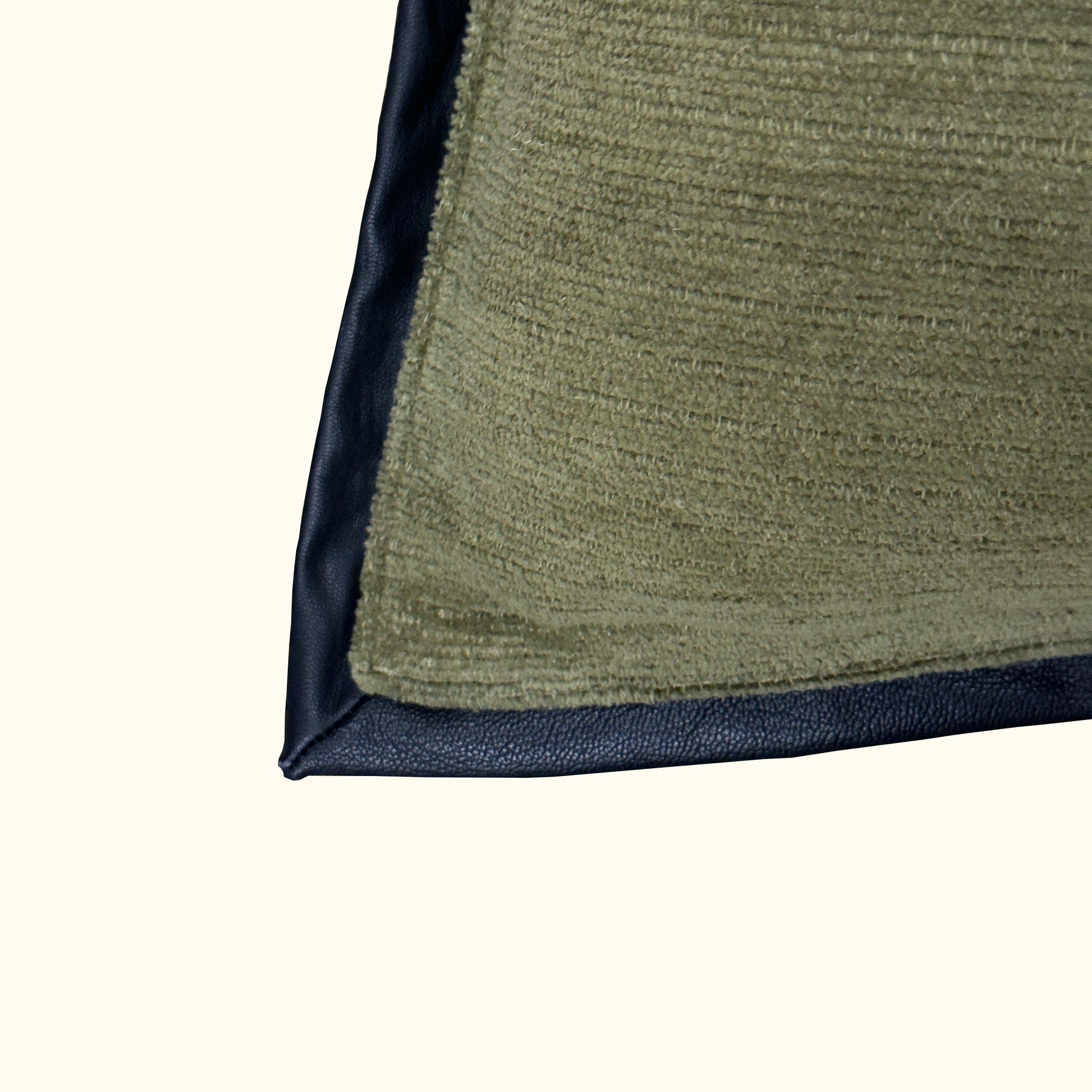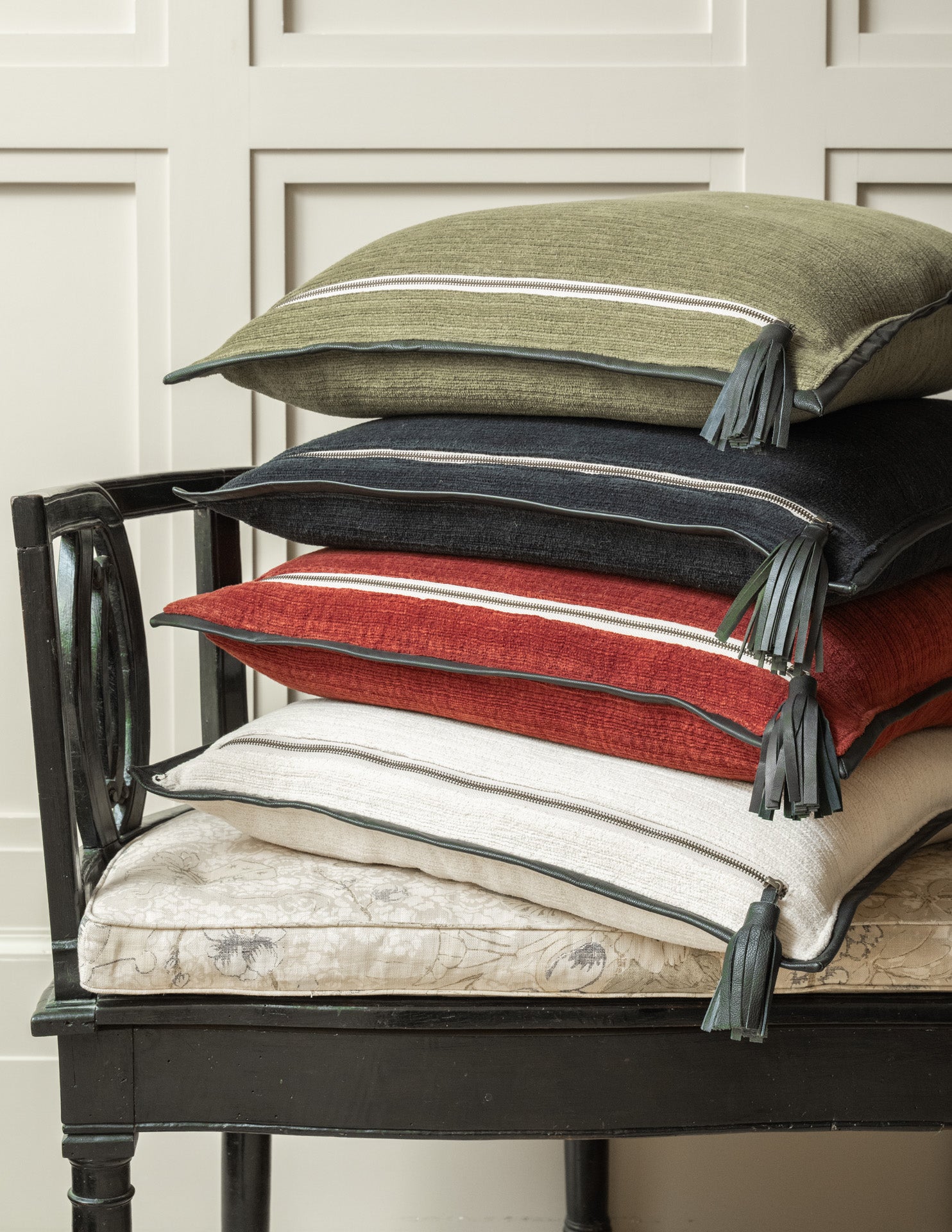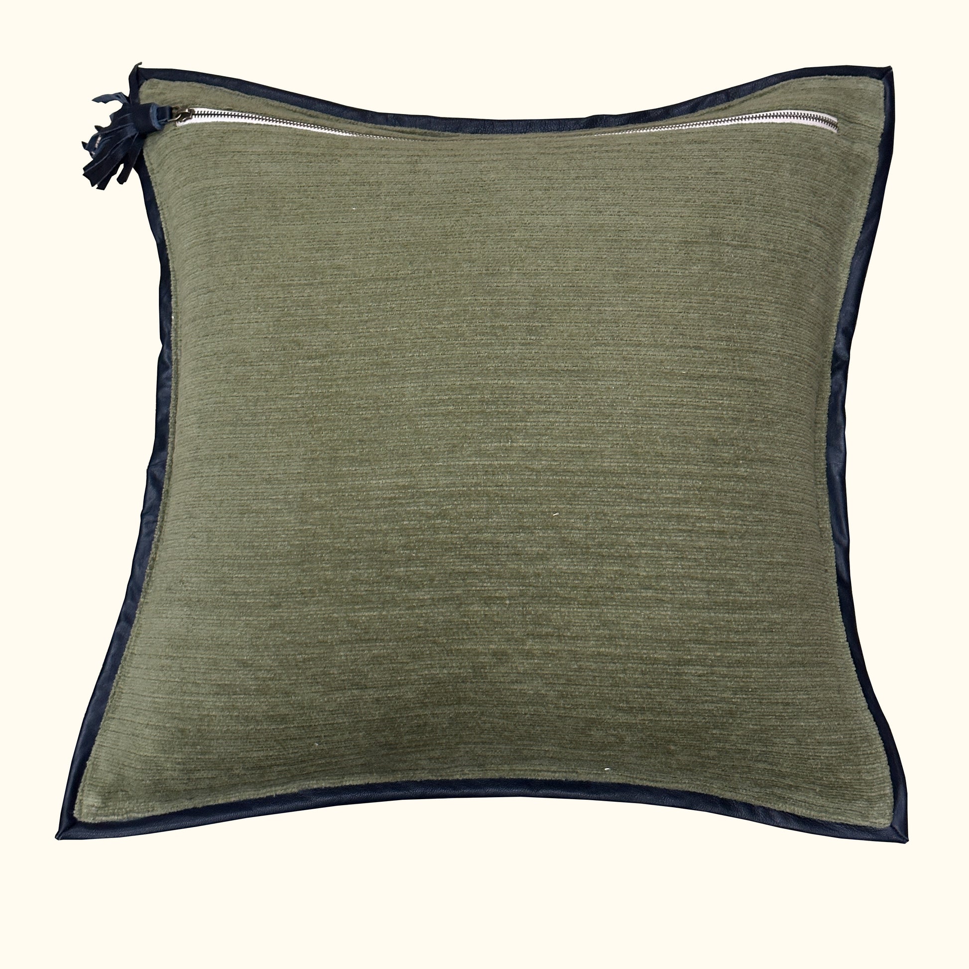 Heavy weight ribbed cotton chenille, bordered with a soft sheep leather flange, create an appealing classic. The added detail of a chunky metal zipper and oversized leather tassel give it a fresh, modern flare.