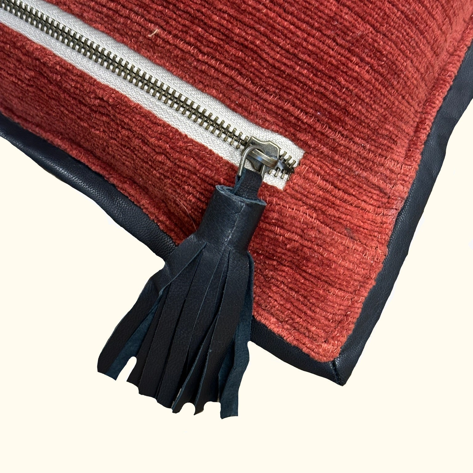 Heavy weight ribbed cotton chenille, bordered with a soft leather flange, create an appealing classic. The added detail of a chunky metal zipper and oversized leather tassel give it a fresh, modern flare.