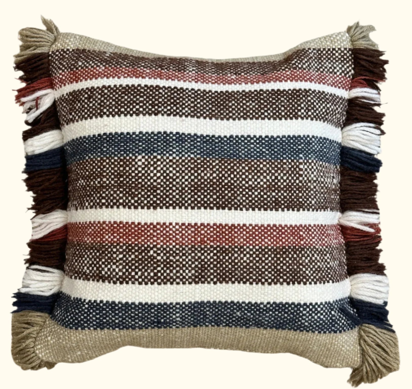 Bold, textural and effortlessly stylish, the Shimla pillow is a celebration of color and craftmanship. Woven from a rich blend of New Zealand wool, alpaca and merino wool, its substantial weight and luxurious hand feel brings warmth and depth to any space. The striped fringe on the sides add a playful yet sophisticated touch.