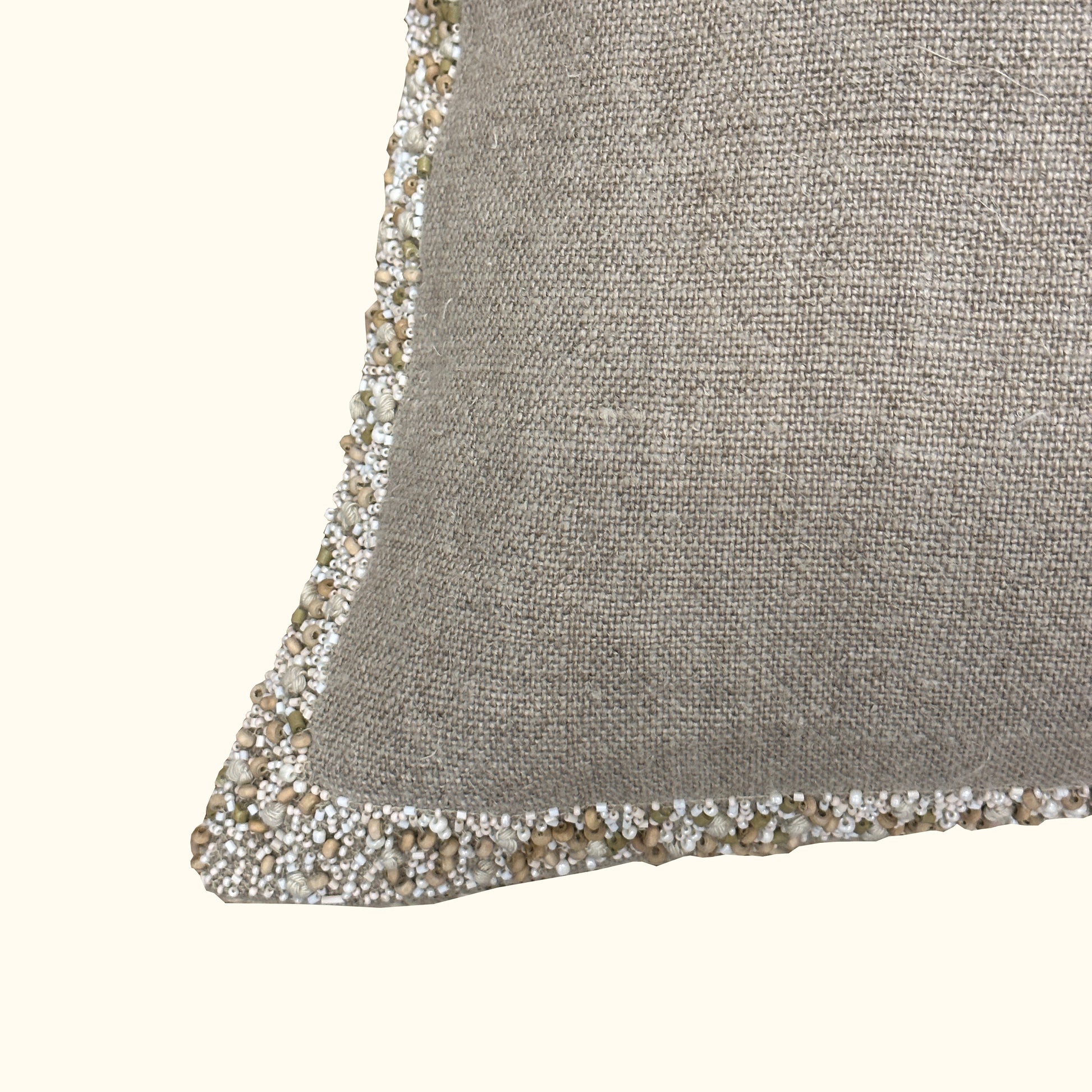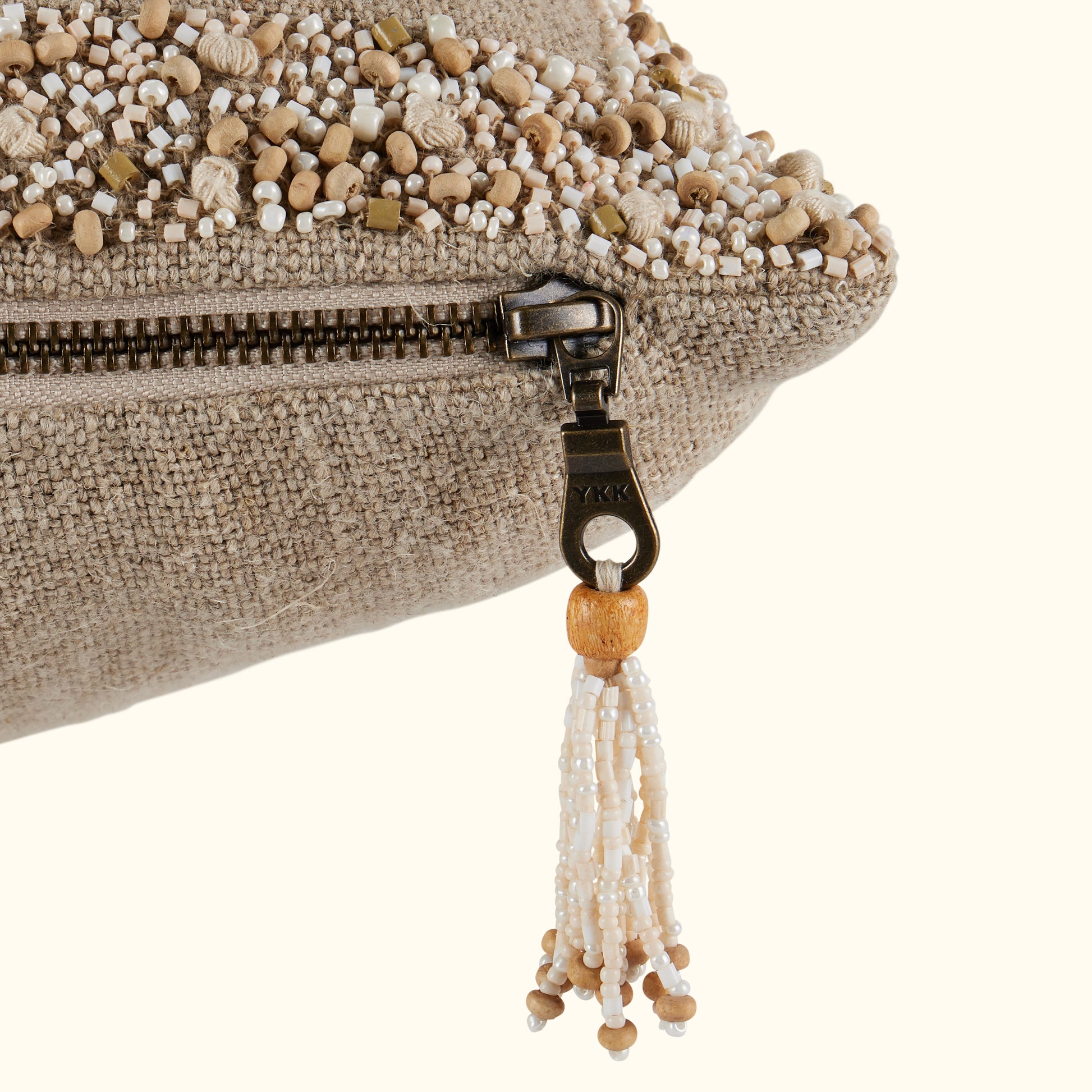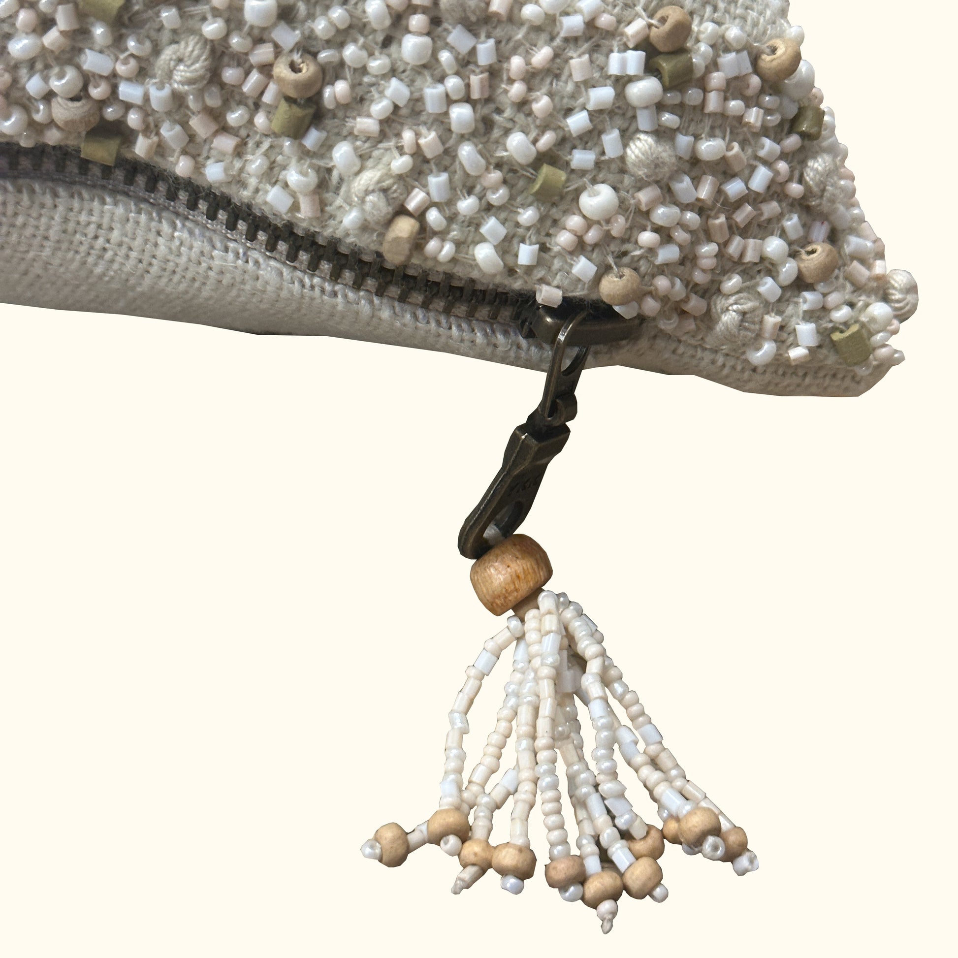 Refined elegance. 100% linen on front and back with a border of hand applied wood and enamel beads including french knots. The finishing touch is the antique metal zipper with a jewelry like, multi strand beaded pull.
