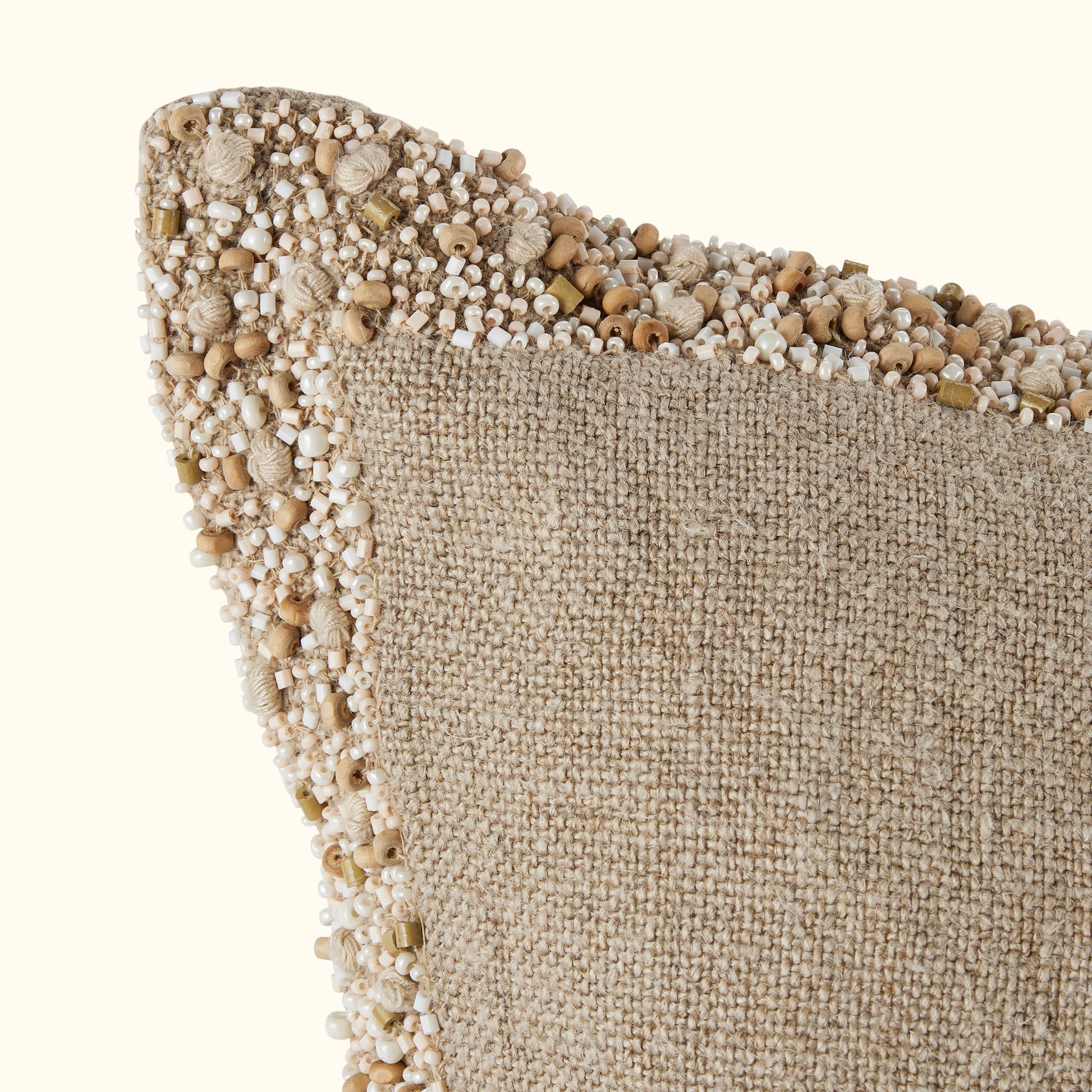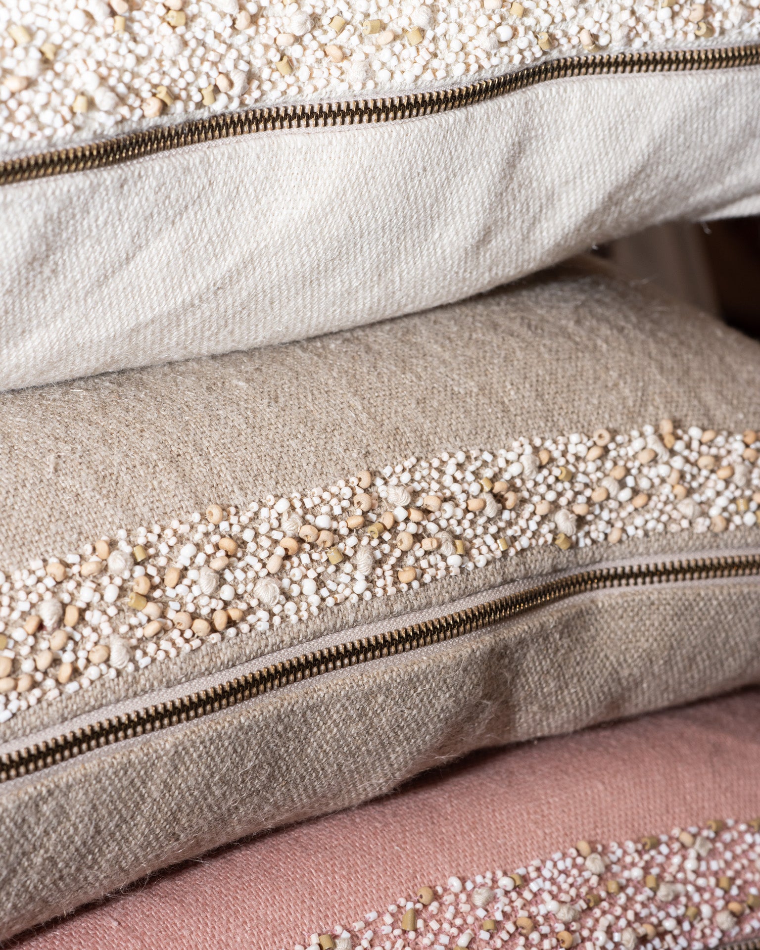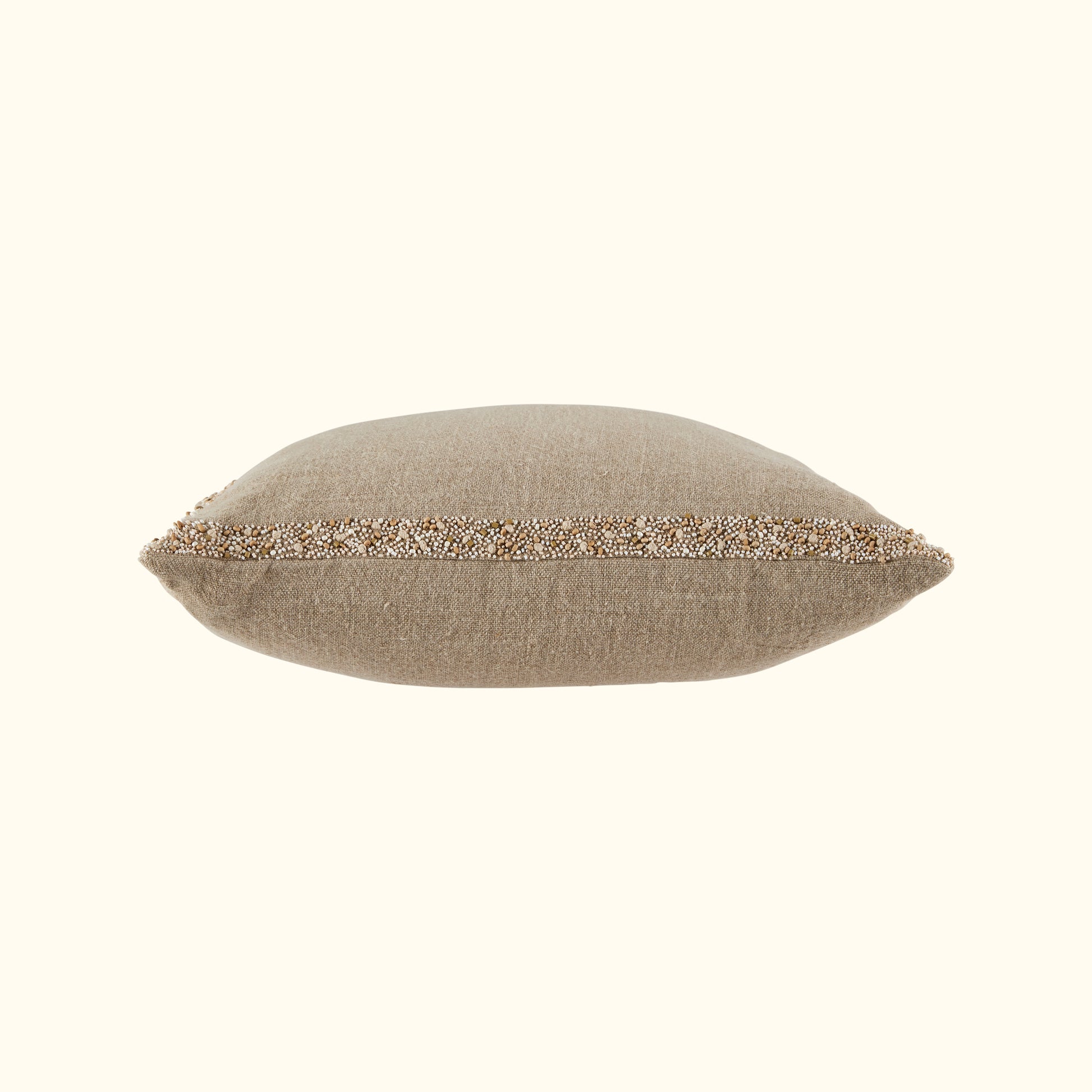 Refined elegance. 100% linen on front and back with a border of hand applied wood and enamel beads including french knots. The finishing touch is the antique metal zipper with a jewelry like, multi strand beaded pull.