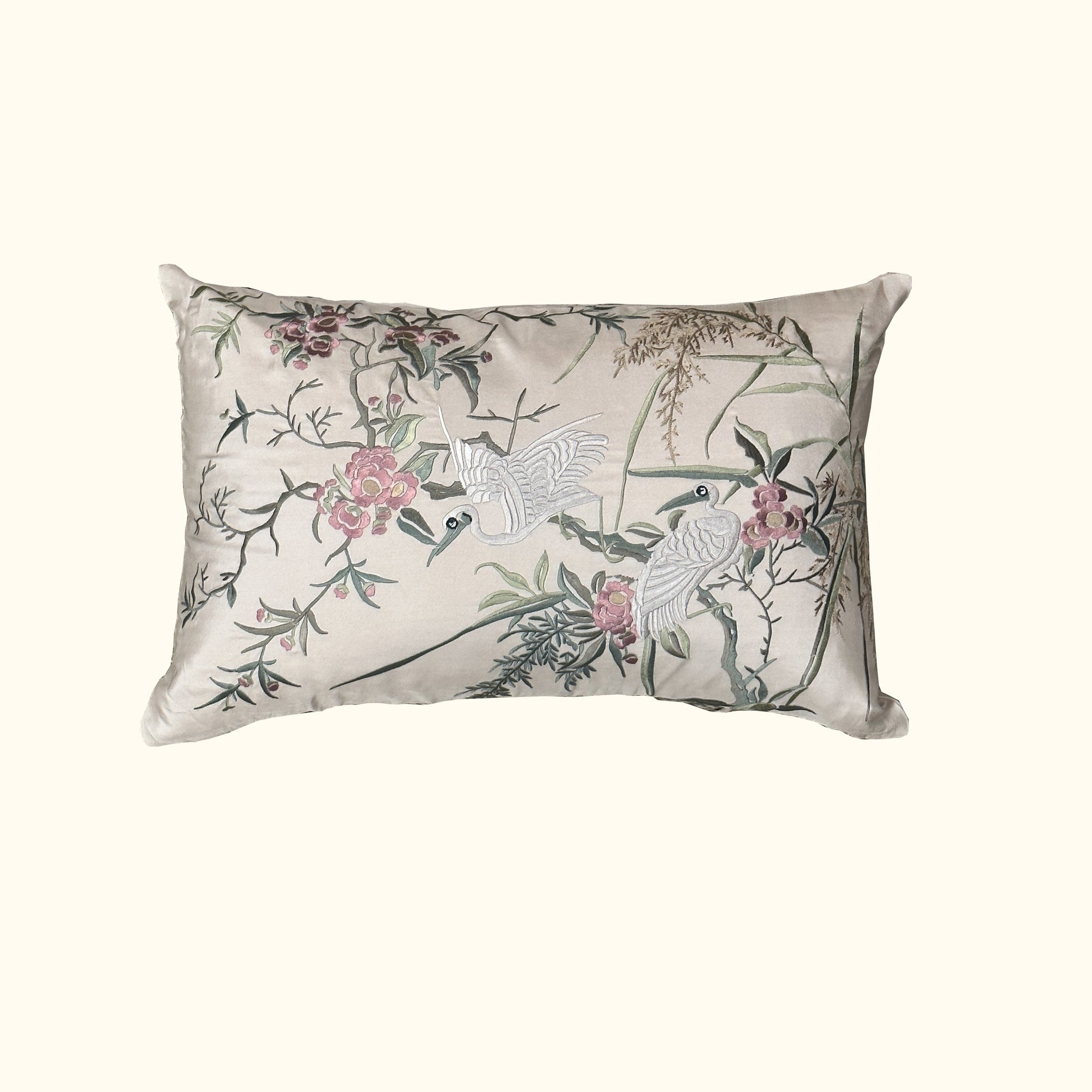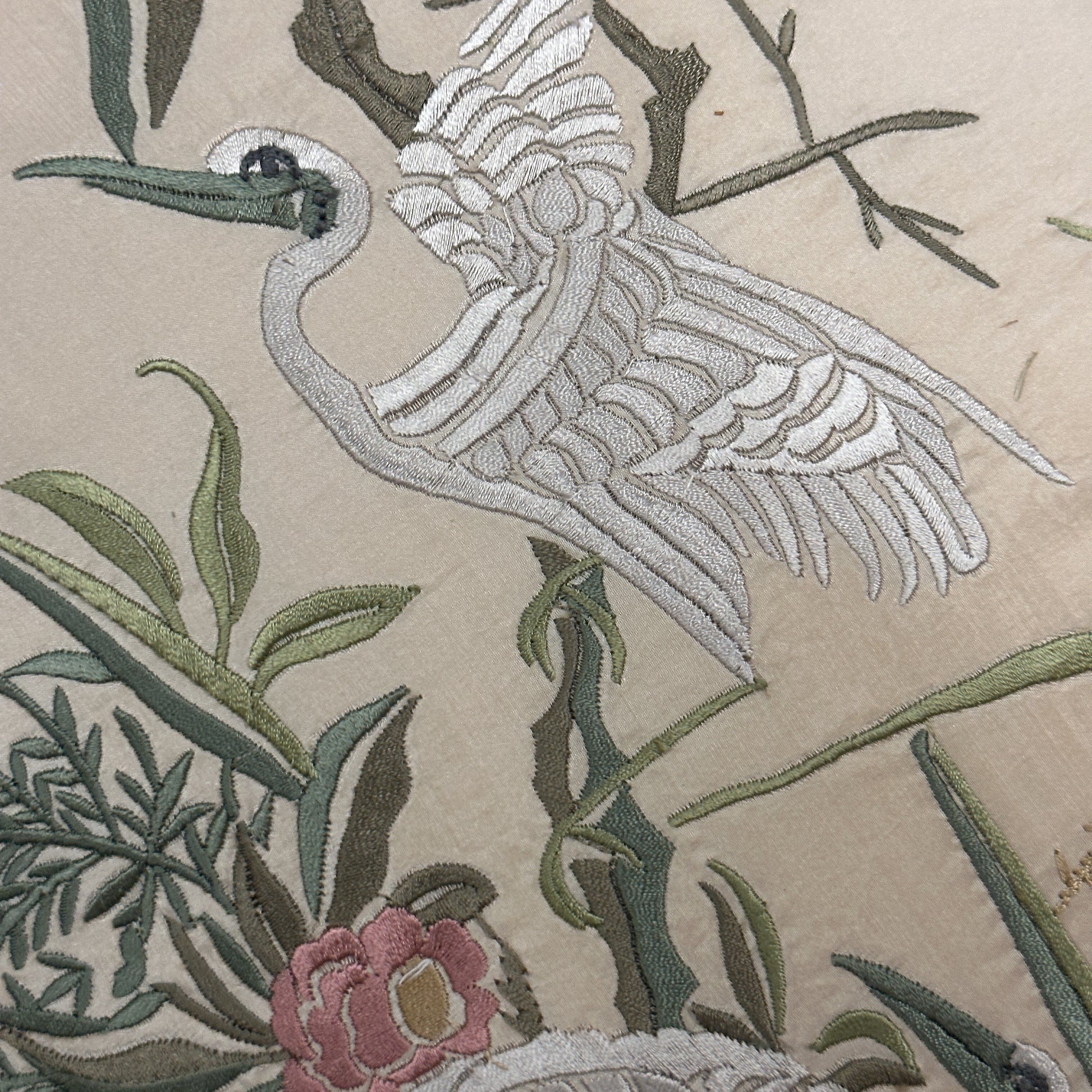Inspired by an original Chinese silk on silk embroidery and rendered in 100% silk. This is an authentic and enduring classic. The crane representing longevity and peace, symbolizes a wish for a long and prosperous life.