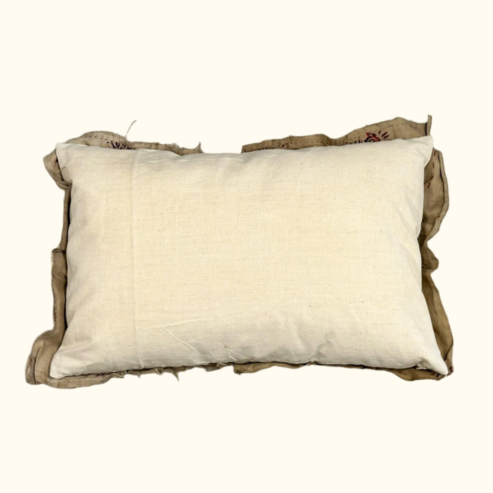 - All pillows are carefully constructed with the finest natural materials. As the fronts are vintage and antique textiles, some imperfections may be present. Great care and attention has been taken to ensure that significant tears or stains have been addressed or avoided. The vintage textiles have been lined, and each pillow is sewn with overlocked inside seams with generous seam allowances and finished with hidden zippers. Back fabrics are either natural linen or cotton velvet.