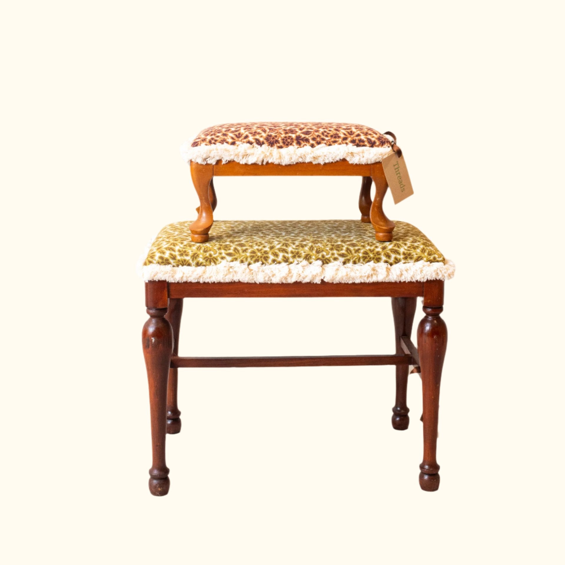 I can never resists a foot stool at a flea market, thrift store or junk shop. They have endless uses (this one was a piano stool). Upholstered in a vintage Zuber floral print c.1920. Adorned with a cotton brush fringe.