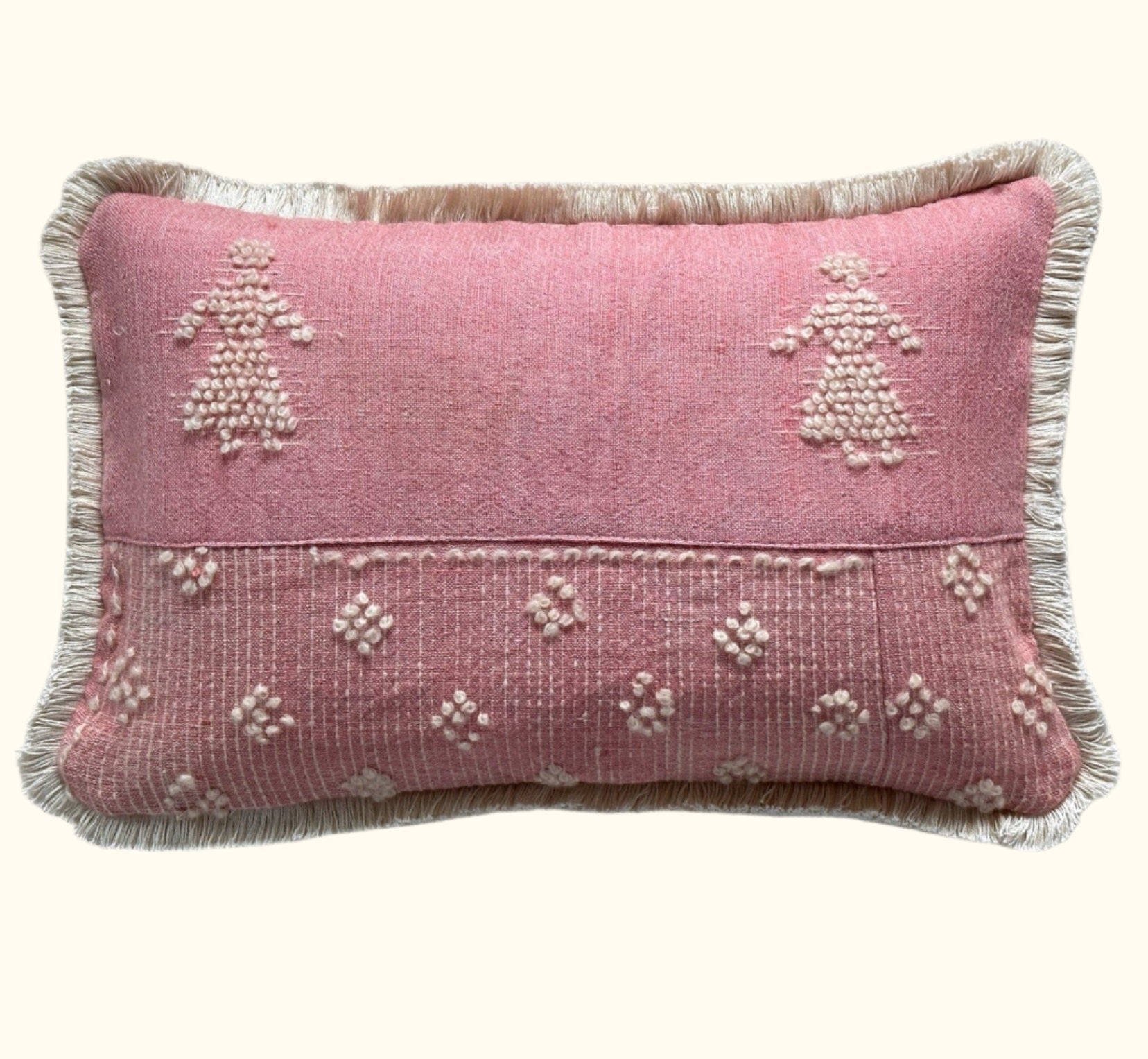 - All pillows are carefully constructed with the finest natural materials. As the fronts are vintage and antique textiles, some imperfections may be present. Great care and attention has been taken to ensure that significant tears or stains have been addressed or avoided. The vintage textiles have been lined, and each pillow is sewn with overlocked inside seams with generous seam allowances and finished with hidden zippers. Back fabrics are either natural linen or cotton velvet.