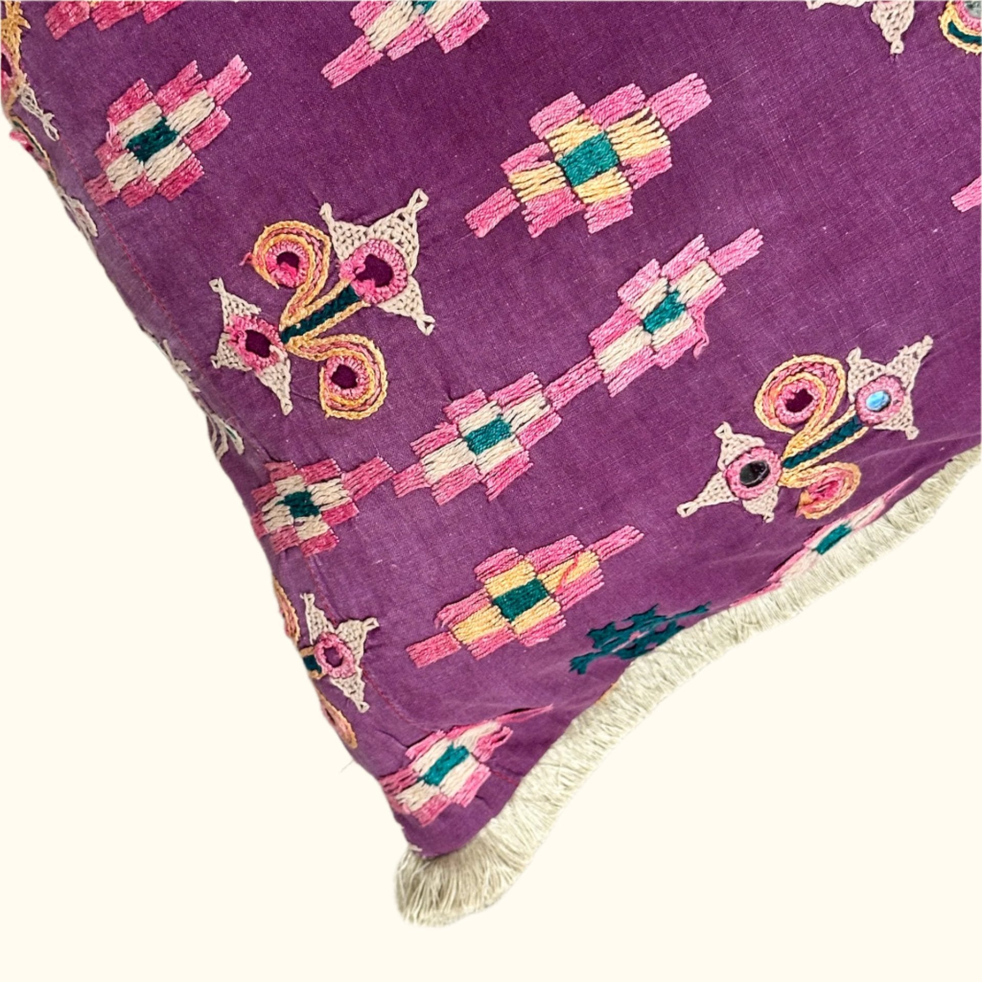 - All pillows are carefully constructed with the finest natural materials. As the fronts are vintage and antique textiles, some imperfections may be present. Great care and attention has been taken to ensure that significant tears or stains have been addressed or avoided. The vintage textiles have been lined, and each pillow is sewn with overlocked inside seams with generous seam allowances and finished with hidden zippers. Back fabrics are either natural linen or cotton velvet.