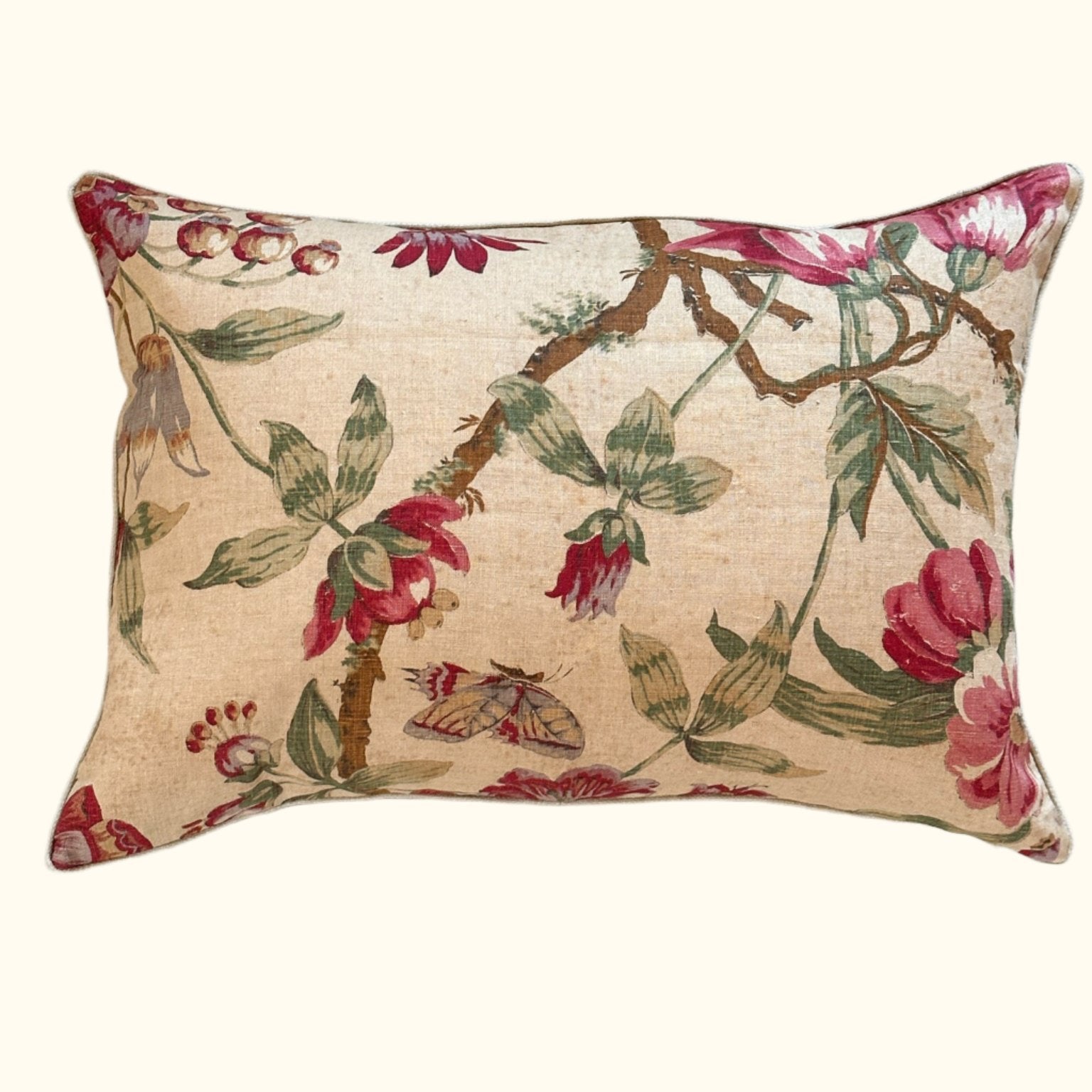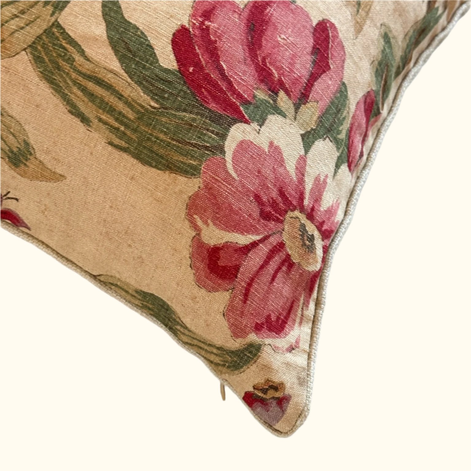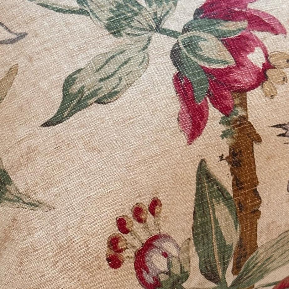 - All pillows are carefully constructed with the finest natural materials. As the fronts are vintage and antique textiles, some imperfections may be present. Great care and attention has been taken to ensure that significant tears or stains have been addressed or avoided. The vintage textiles have been lined, and each pillow is sewn with overlocked inside seams with generous seam allowances and finished with hidden zippers. Back fabrics are either natural linen or cotton velvet.
