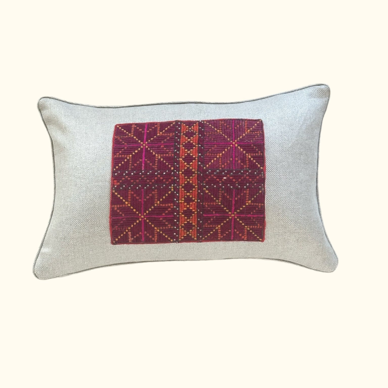 - All pillows are carefully constructed with the finest natural materials. As the fronts are vintage and antique textiles, some imperfections may be present. Great care and attention has been taken to ensure that significant tears or stains have been addressed or avoided. The vintage textiles have been lined, and each pillow is sewn with overlocked inside seams with generous seam allowances and finished with hidden zippers. Back fabrics are either natural linen or cotton velvet.