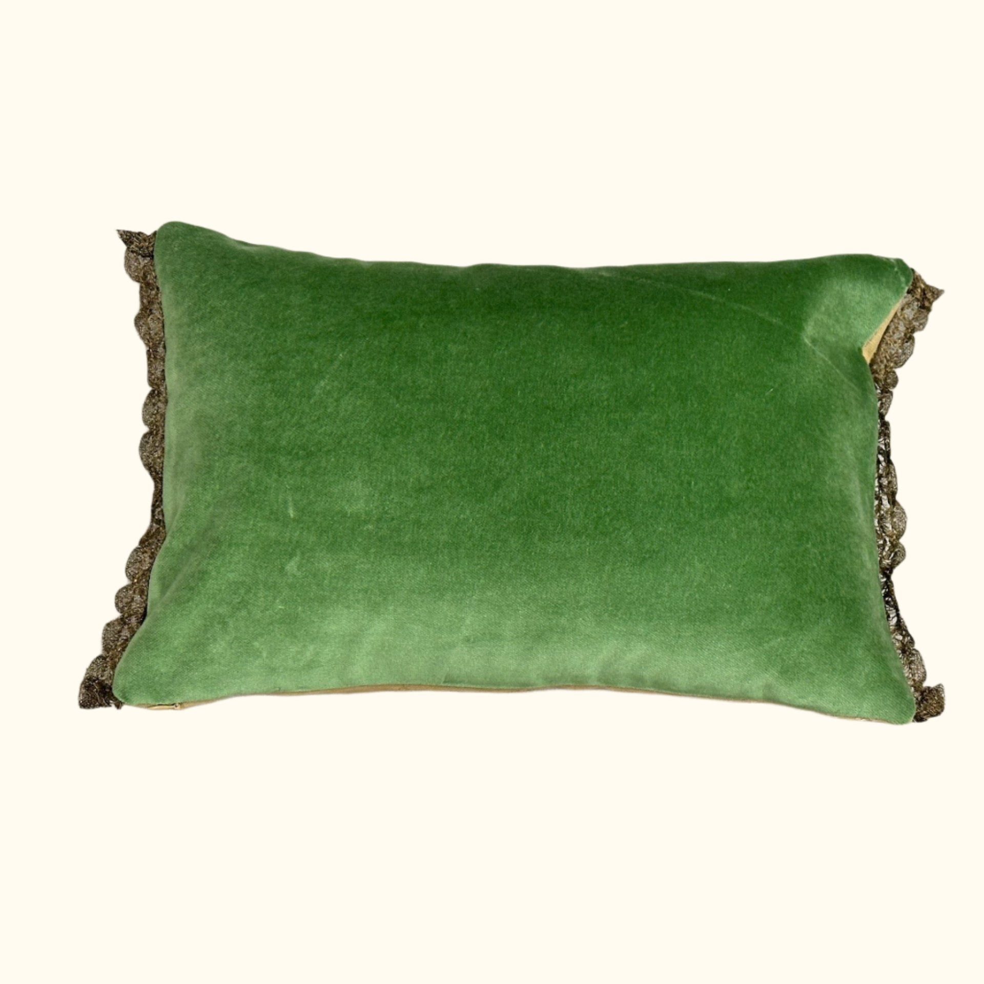 - All pillows are carefully constructed with the finest natural materials. As the fronts are vintage and antique textiles, some imperfections may be present. Great care and attention has been taken to ensure that significant tears or stains have been addressed or avoided. The vintage textiles have been lined, and each pillow is sewn with overlocked inside seams with generous seam allowances and finished with hidden zippers. Back fabrics are either natural linen or cotton velvet.